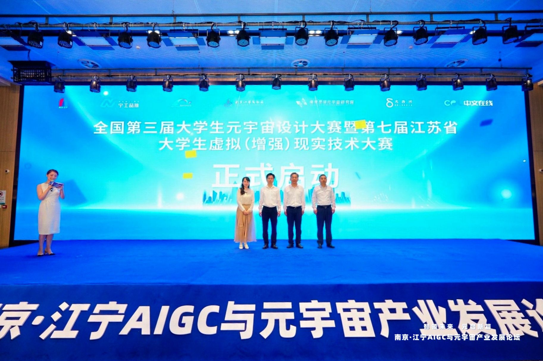 6月25日,,,,,南京市江宁区举行南京·江宁 AIGC与元宇宙工业生长论坛暨元宇宙供需对接大会。。。。。。。。我校副校长叶智锐代表学校出席,,,,,为天下第二届大学生元宇宙设计大赛暨第六届江苏省大学生虚拟(增强)现实手艺大赛获奖选手颁奖,,,,,并与嘉宾配合启动新一届大赛。。。。。。。。