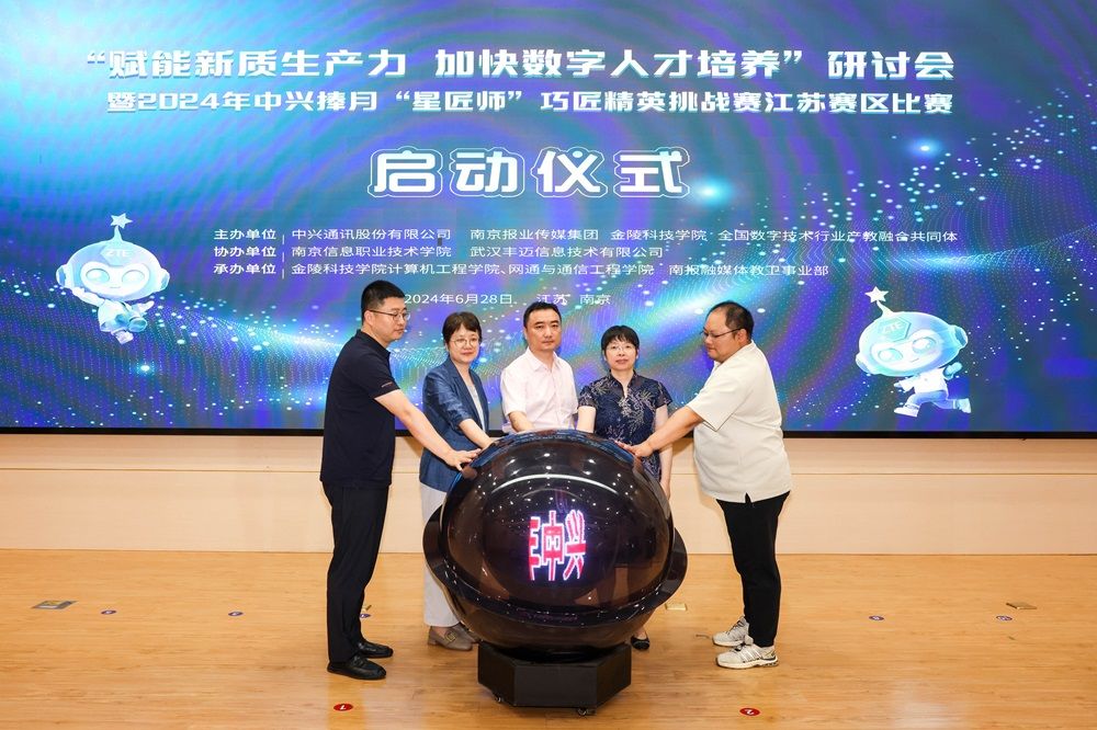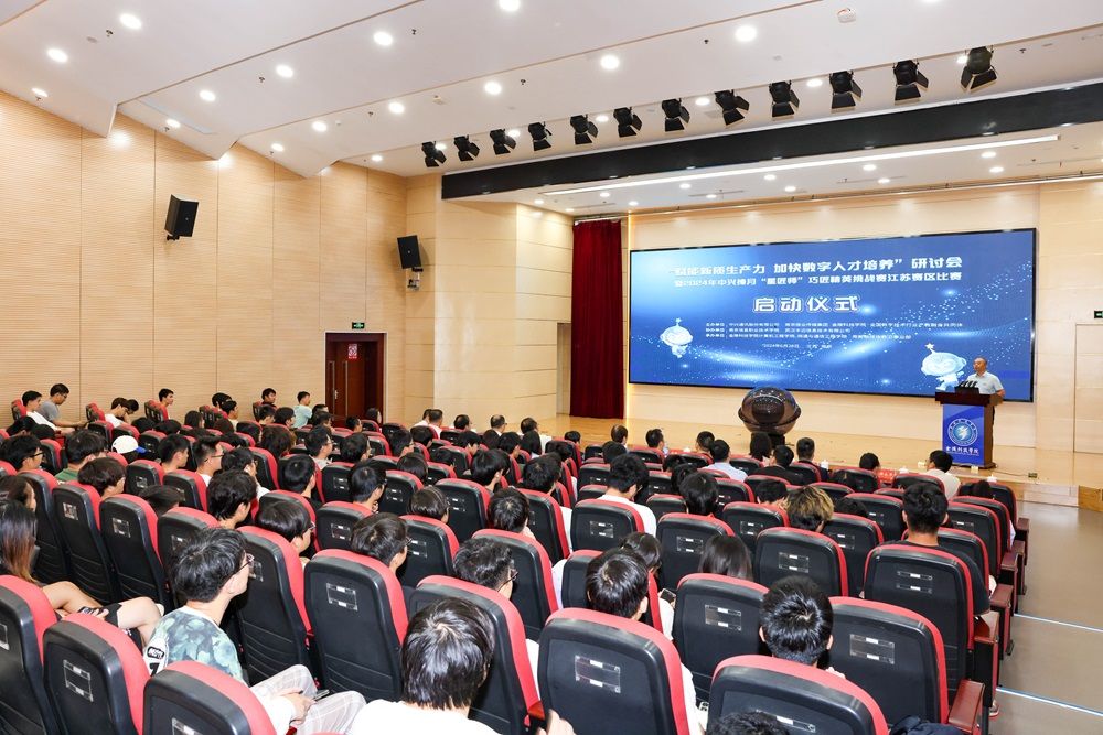 6月28日,,,,,,,“赋能新质生产力 加速数字人才作育”钻研会暨2024年中兴捧月“星匠师”巧匠精英挑战赛江苏赛区角逐启动仪式在我校举行,,,,,,,东南大学、中兴通讯、辽宁向日葵等众多专家学者加入运动。。。。。。副校长张燕加入启动仪式并致辞。。。。。。