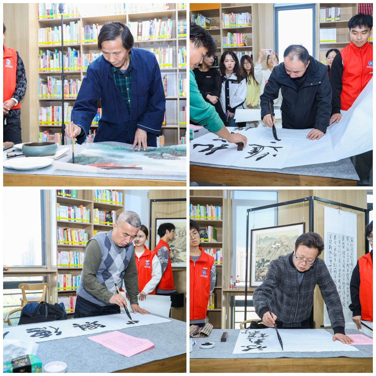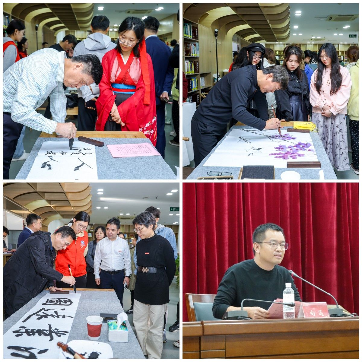 会后,,,,,,,,文化艺术名家们来到图书馆职工书屋铺纸蘸墨,,,,,,,,恣意展示精湛的字画武艺,,,,,,,,笔到之处或苍劲有力,,,,,,,,或厚重敦实,,,,,,,,或萧洒灵动,,,,,,,,或温顺圆润,,,,,,,,一幅幅字画作品引得在场师生驻足许久,,,,,,,,赞叹喝彩。。。。。与此同时,,,,,,,,一场文学沙龙在图书馆第二报告厅开展,,,,,,,,向迅带来题为《童年生涯履历对文学创作的影响》的精彩报告,,,,,,,,分享了自己对文学的一些基本看法以及文学创作的要领与心得。。。。。书法、绘画、文学“好戏连台”,,,,,,,,让师生们享受了一场雅致的美学盛宴,,,,,,,,感受到文都南京的奇异魅力。。。。。