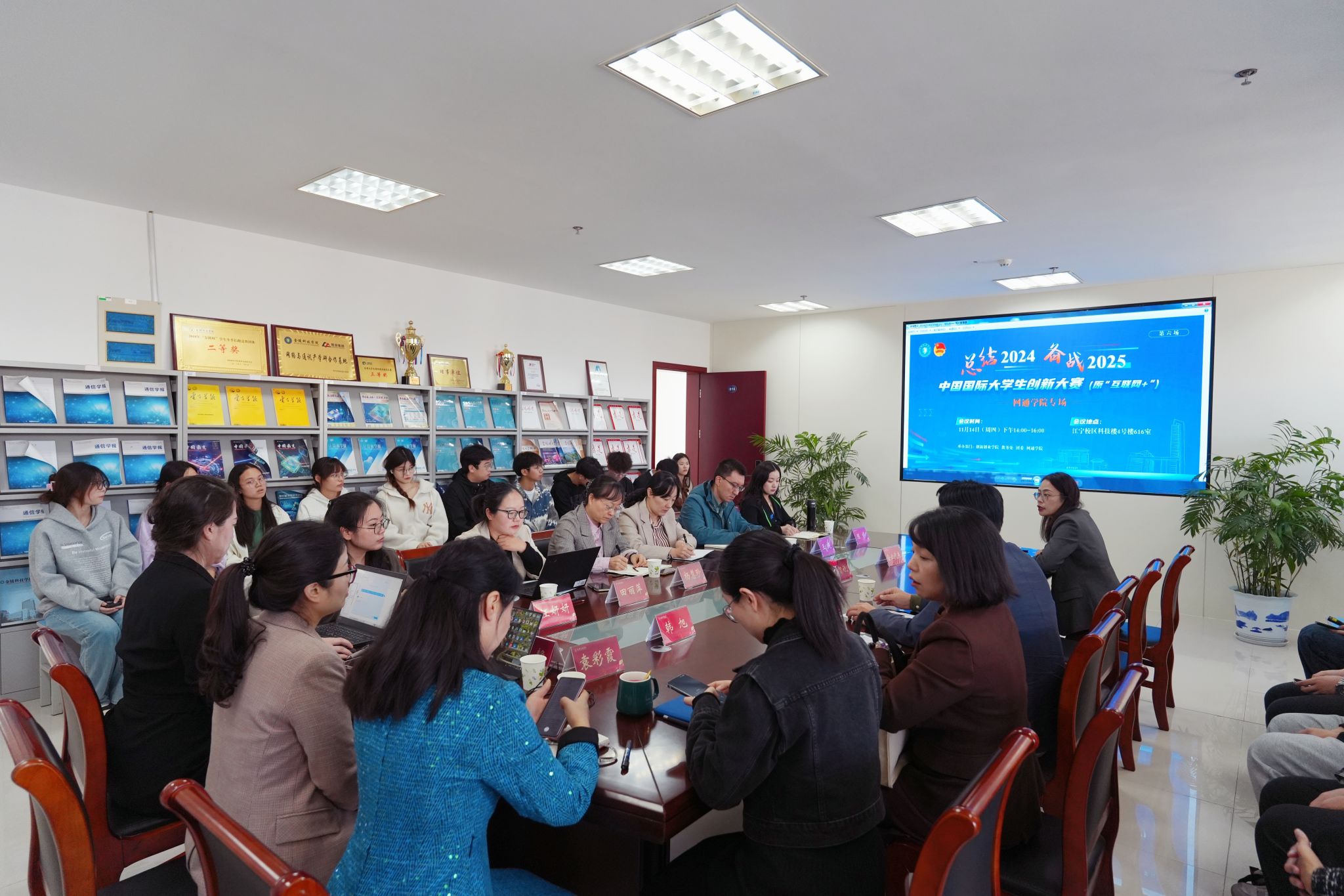 11月14日下昼,,,,,由立异创业学院、教务处、团委、网络与通讯工程学院团结举行的“总结2024,,,,,备战2025——中国国际大学生立异大赛(原“互联网+”)网络与通讯工程学院专场”运动在江宁校区举行。。。。。。。。副校长叶智锐出席,,,,,多伦科技股份有限公司高级工程师陈波、团委书记韩旭、网络与通讯工程学院党委书记沐阳及项目团队师生加入。。。。。。。。