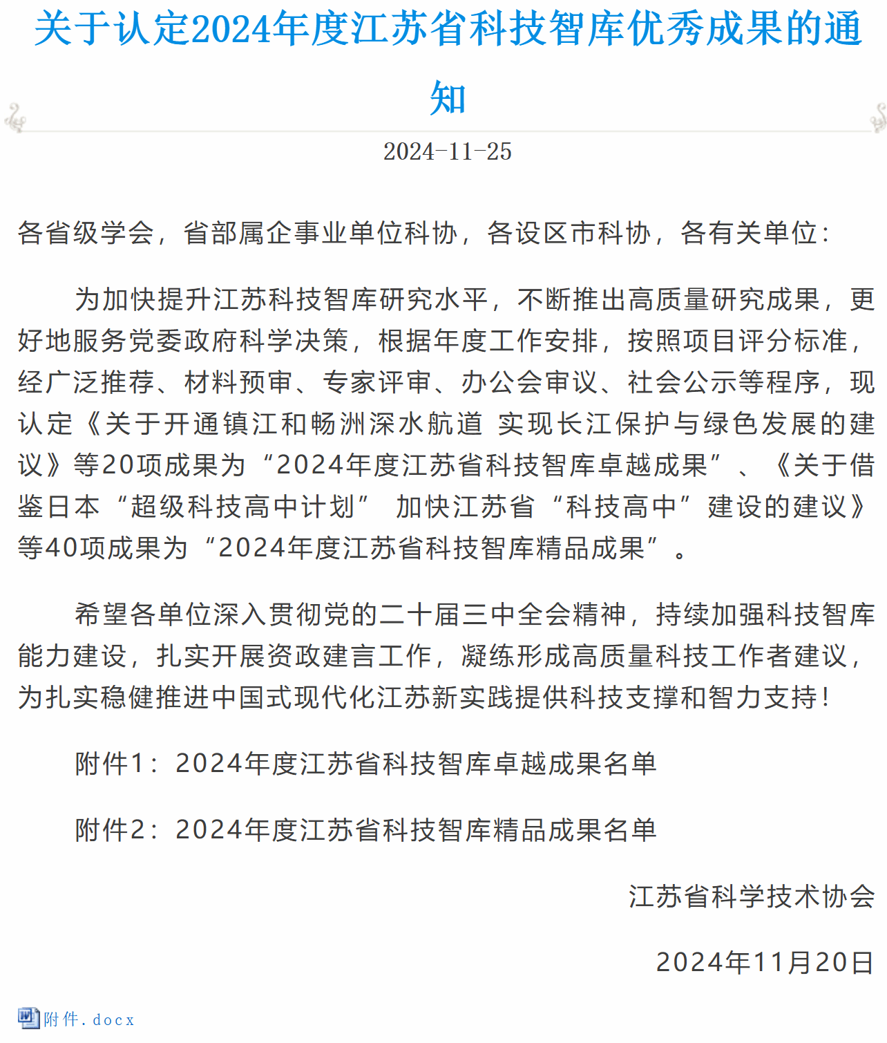11月20日,,,,,江苏省科学手艺协会宣布《关于认定2024年度江苏省科技智库优异效果的通知》。。。。。。。。我校刘永彪教授、李忠海副教授、陈浩博博士撰写的《以数实加速融合助力高质量生长——江苏加速建设“数实融合强省”战略研究》决议咨询报告,,,,,被认定为“2024年度江苏省科技智库卓越效果(省一等奖)”。。。。。。。。这既是我校首次获评江苏省科技智库卓越效果奖项,,,,,也是我校数字经济团队组建以来第六次获评省、市级优异智库效果奖项。。。。。。。。此次评选运动在全省规模内开展,,,,,经普遍推荐、质料预审、专家评审、办公会审议等环节,,,,,最终认定60项优异效果。。。。。。。。其中,,,,,卓越效果20项、精品效果40项。。。。。。。。