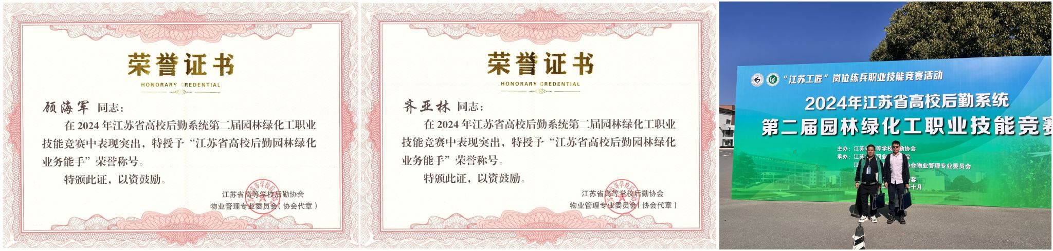 2024年12月20日,,,,,江苏省高校后勤系统第二届园林绿化工职业手艺竞赛颁奖大会在镇江召开。。。。。。此次大赛吸引了来自全省40所高校、76名选手参赛,,,,,我校后勤实业总公司情形效劳中心员工顾水师、齐亚林荣获“江苏省高校后勤园林绿化营业能手”称呼。。。。。。