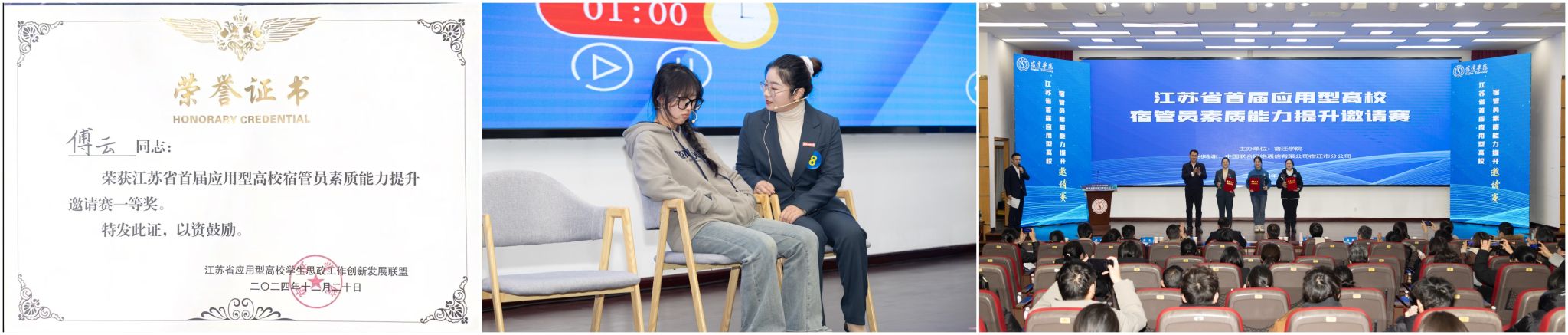 2024年12月19-20日,,,,,江苏省首届应用型高校宿管员素质能力提升约请赛在宿迁学院举行。。。。。。此次约请赛共有来自14所省内应用型高校的14名宿舍治理员同台竞技,,,,,我校后勤实业总公司宿舍效劳中心员工傅云,,,,,在学生事情处的鼎力大举指导下,,,,,从众多参赛选手中脱颖而出,,,,,荣获一等奖。。。。。。
