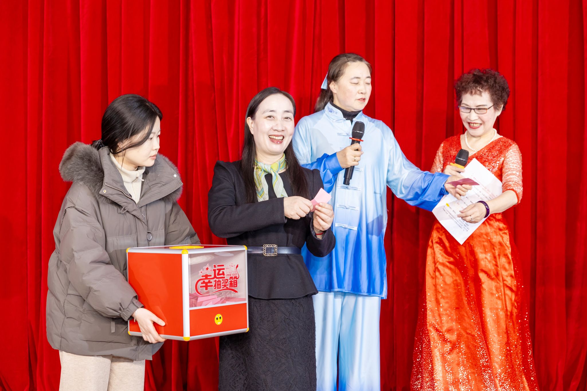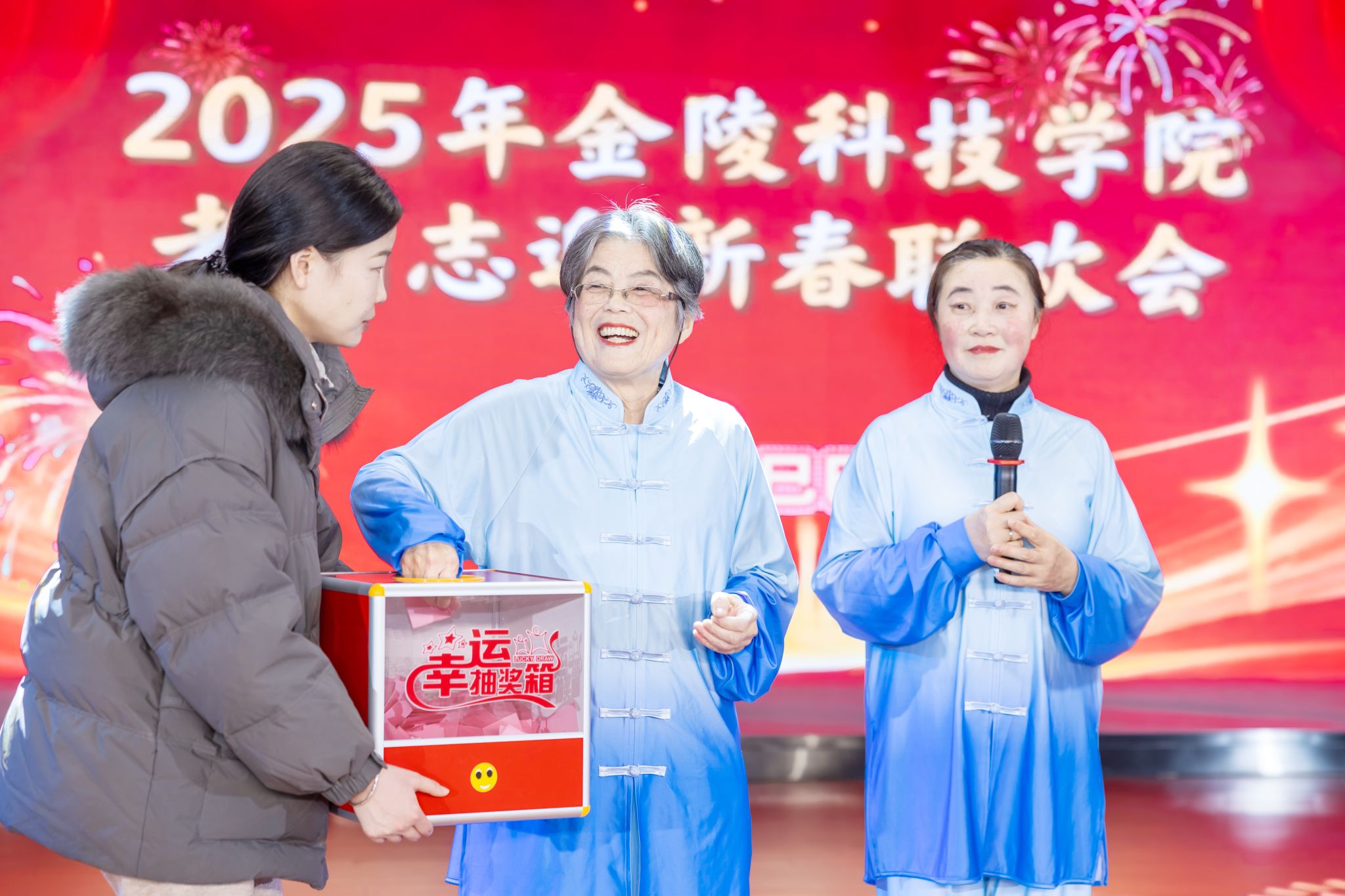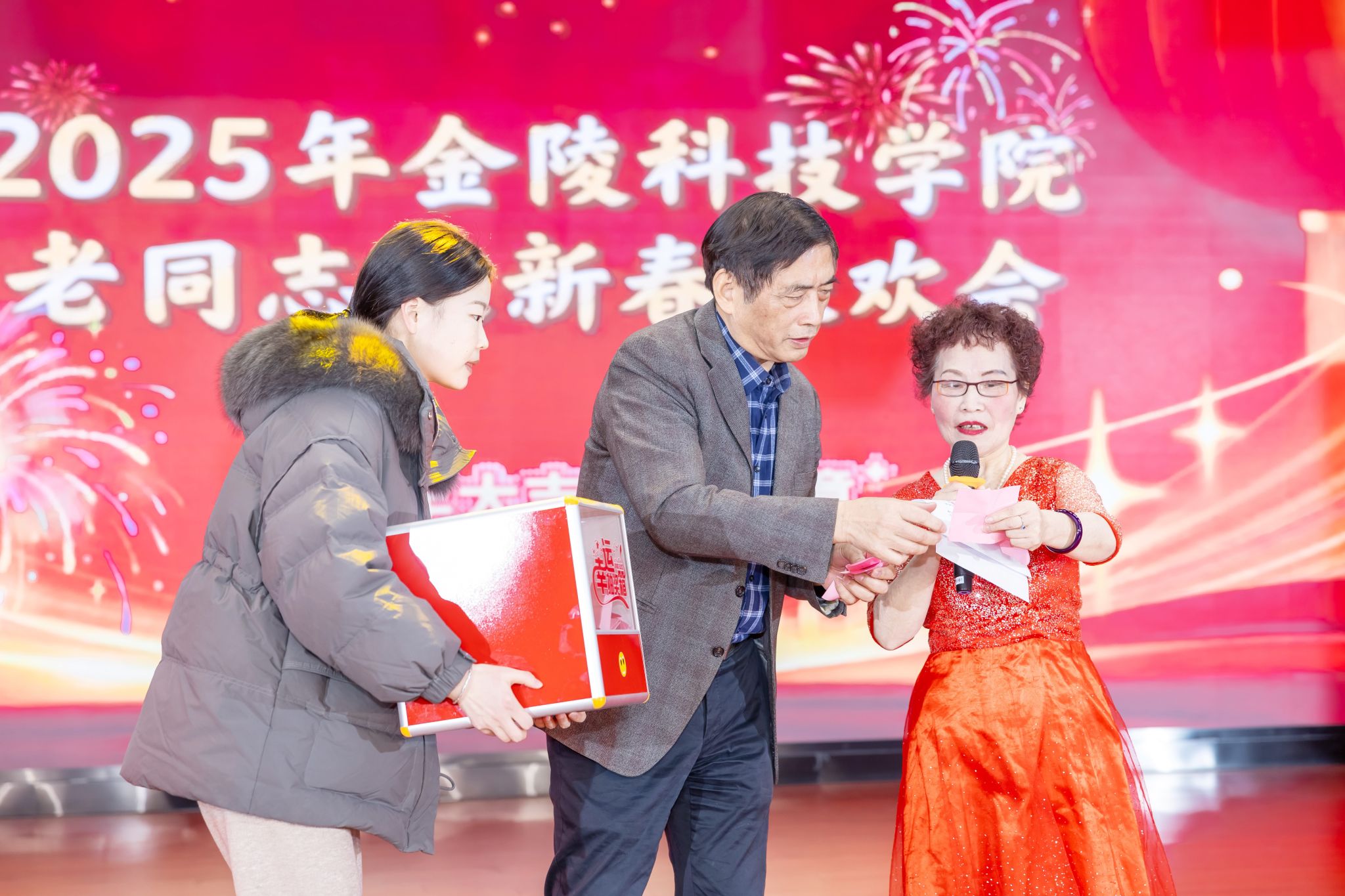 幸运抽奖环节为联欢会增添了兴趣和惊喜,,,,,现场气氛一连升温,,,,,副校长顾晓燕、校关工委常务副主任谢培苏、校退教协会会长刘卫东划分抽取一、二、三等奖项,,,,,为获奖职员颁奖并合影贪恋。。。。。。。。