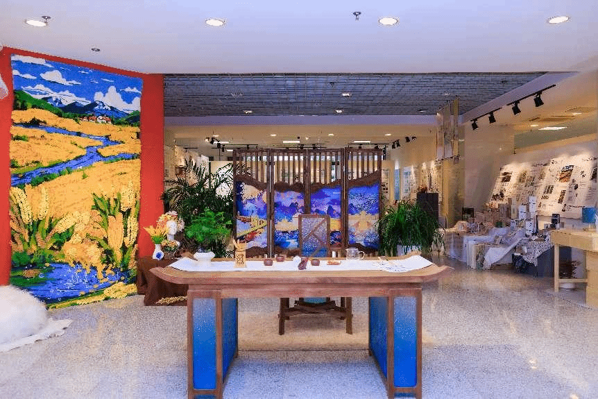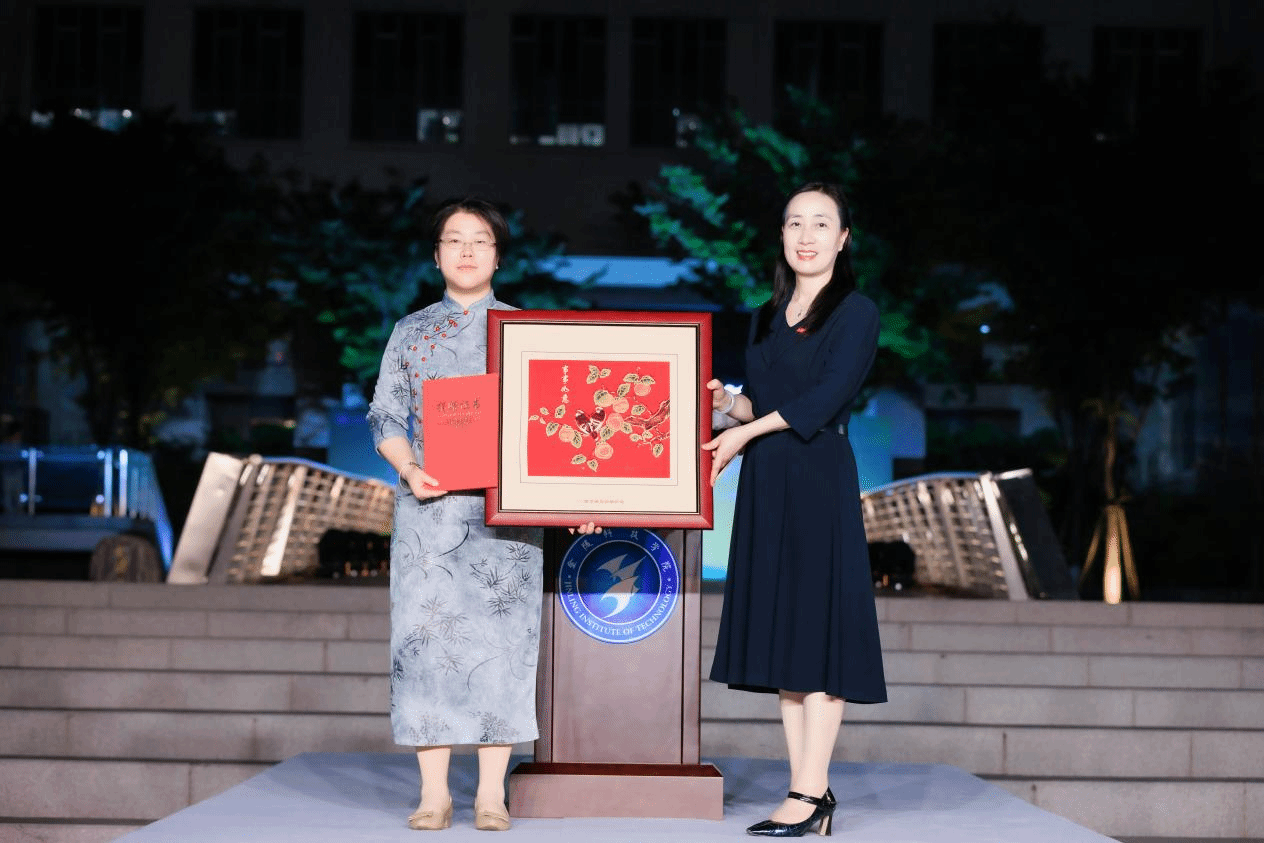 校友陈林捐赠云锦作品《事事如意》,,,,,,,,顾晓燕向其揭晓捐赠证书。。。。。