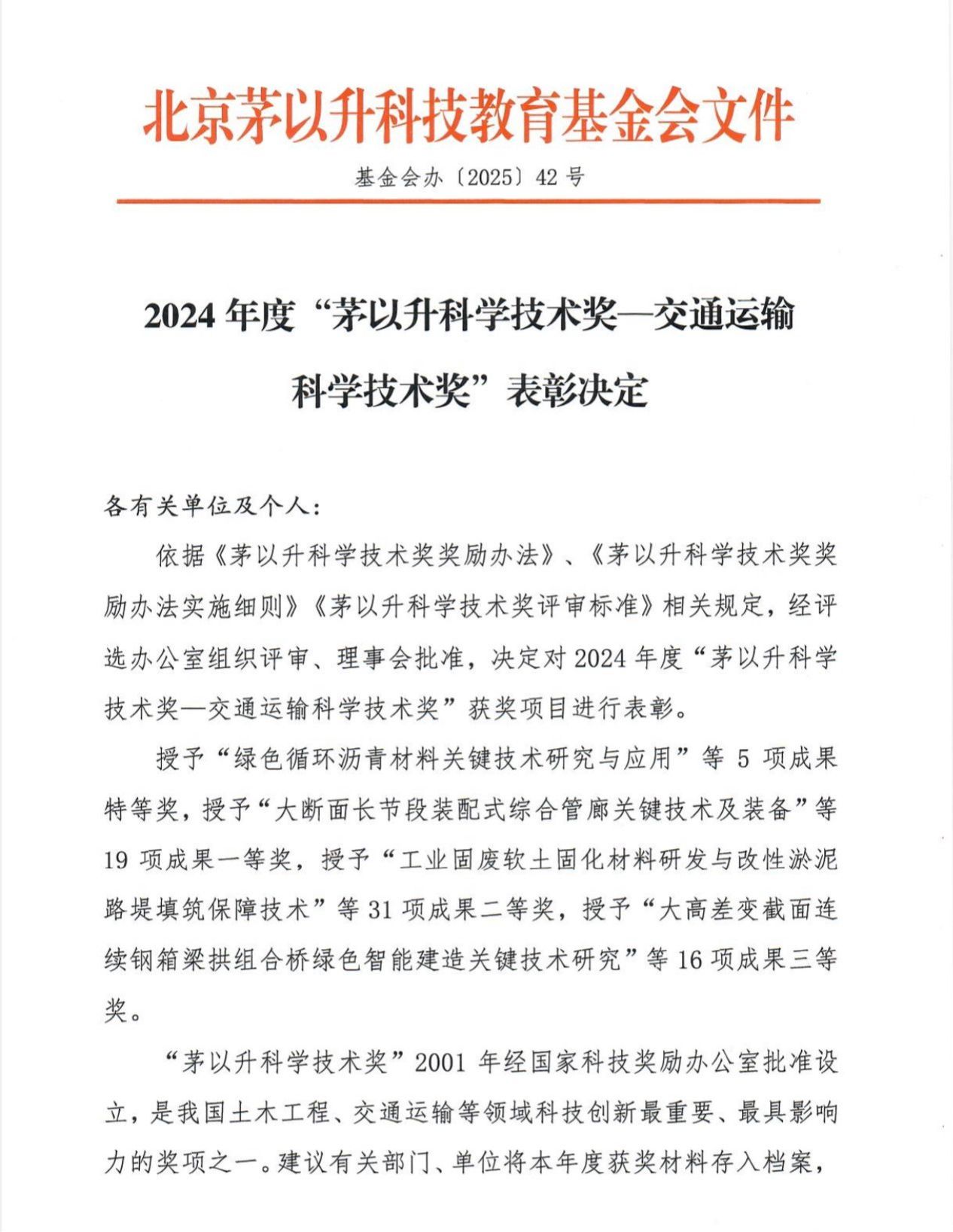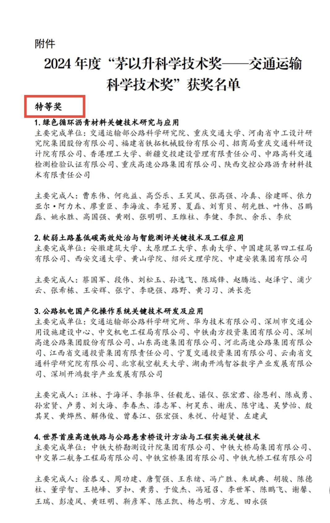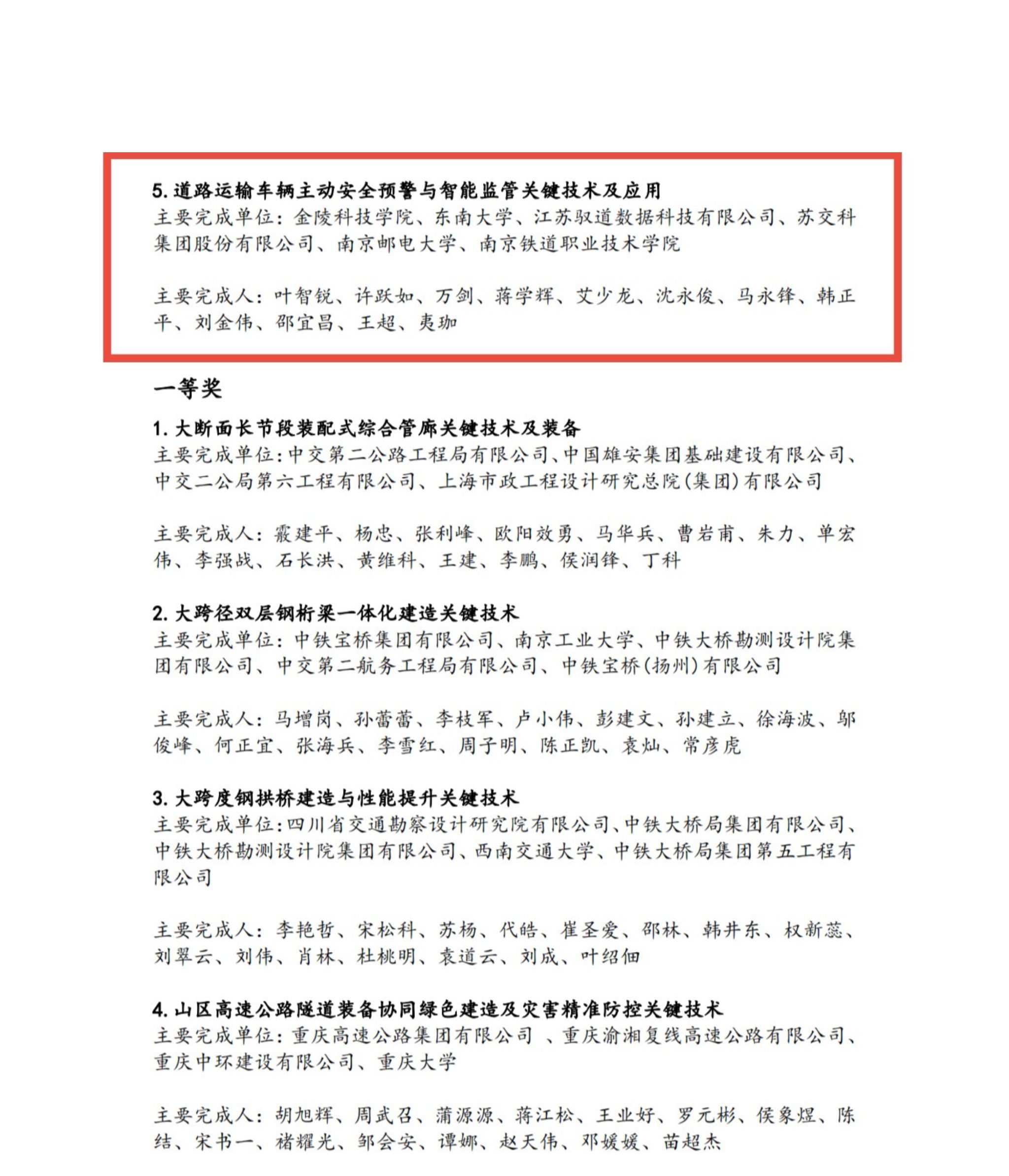茅以升科学手艺奖2001年经科技部科技奖励办公室批准设立,,,,,是我领土木匠程、交通运输等领域科技立异最主要、最具影响力的天下性科学手艺类奖项之一。。。。。。。。本次科技奖项面向天下规模征集申报,,,,,经质料预审、专家初评、现场答辩等环节,,,,,最终评定71项效果获得殊荣,,,,,其中最高奖——特等奖仅5项。。。。。。。。我校申报的效果从天下众多优异交通科技研发项目中脱颖而出,,,,,彰显了我校在交通运输领域手艺研发与科技立异的扎实效果。。。。。。。。