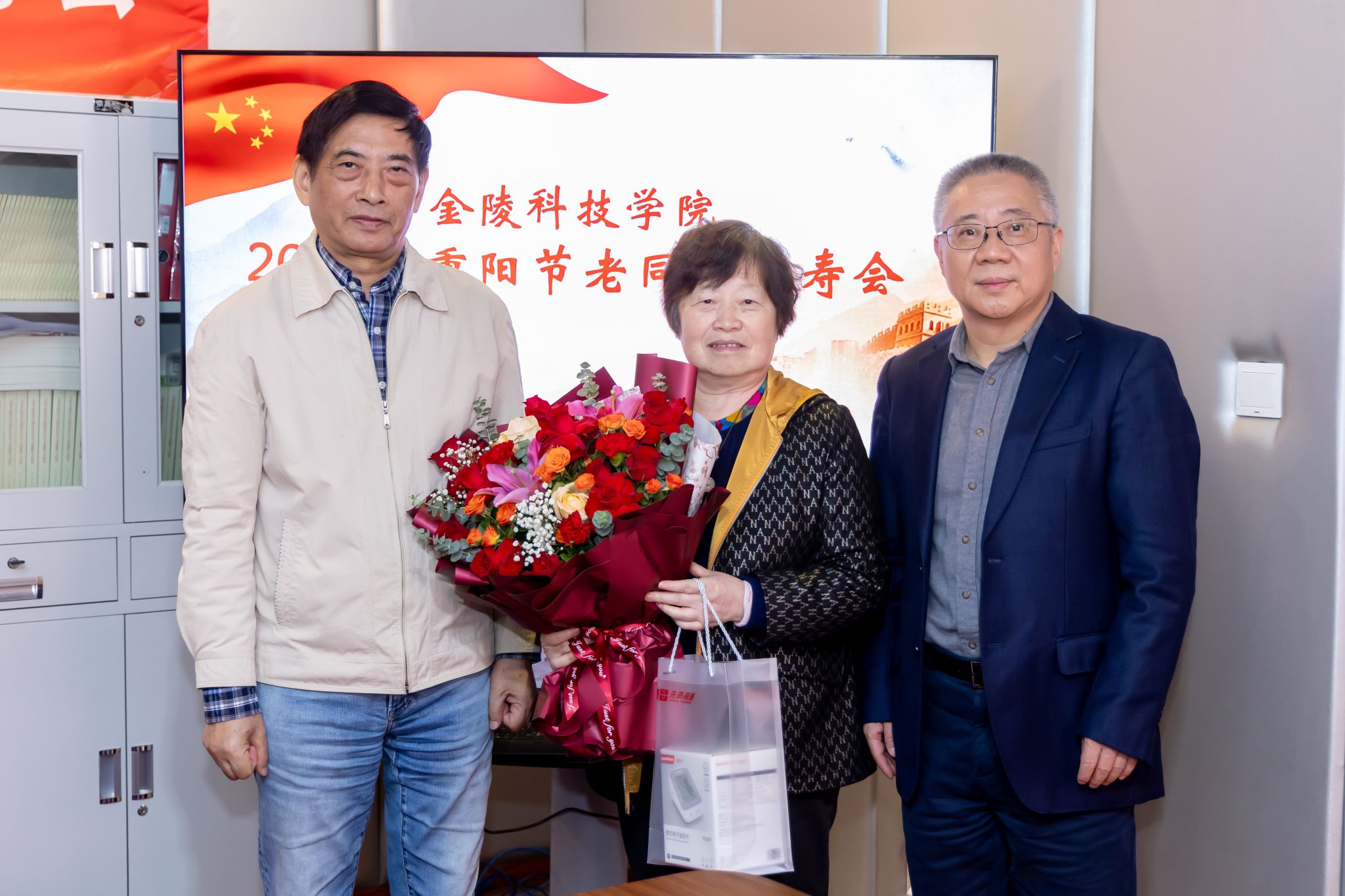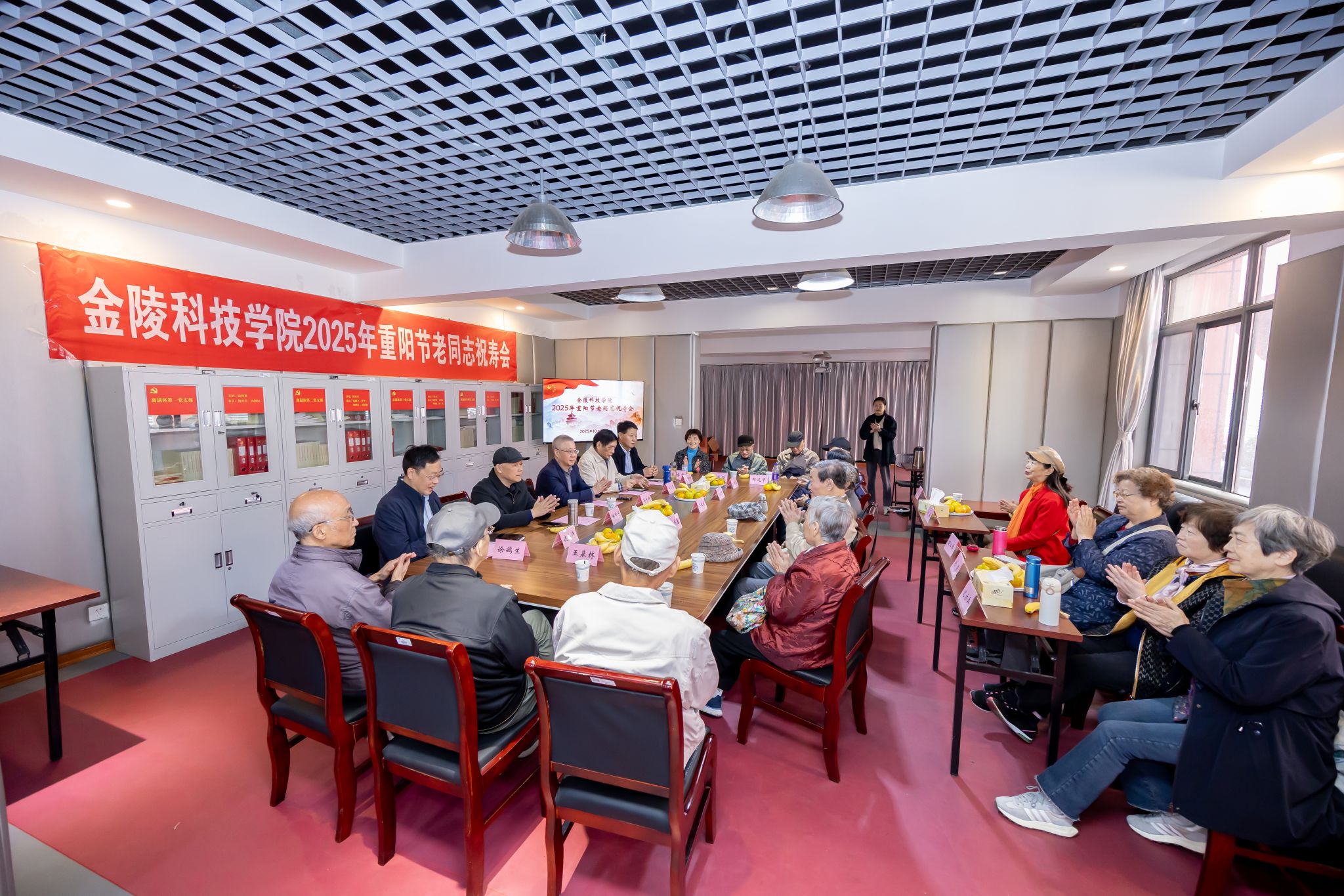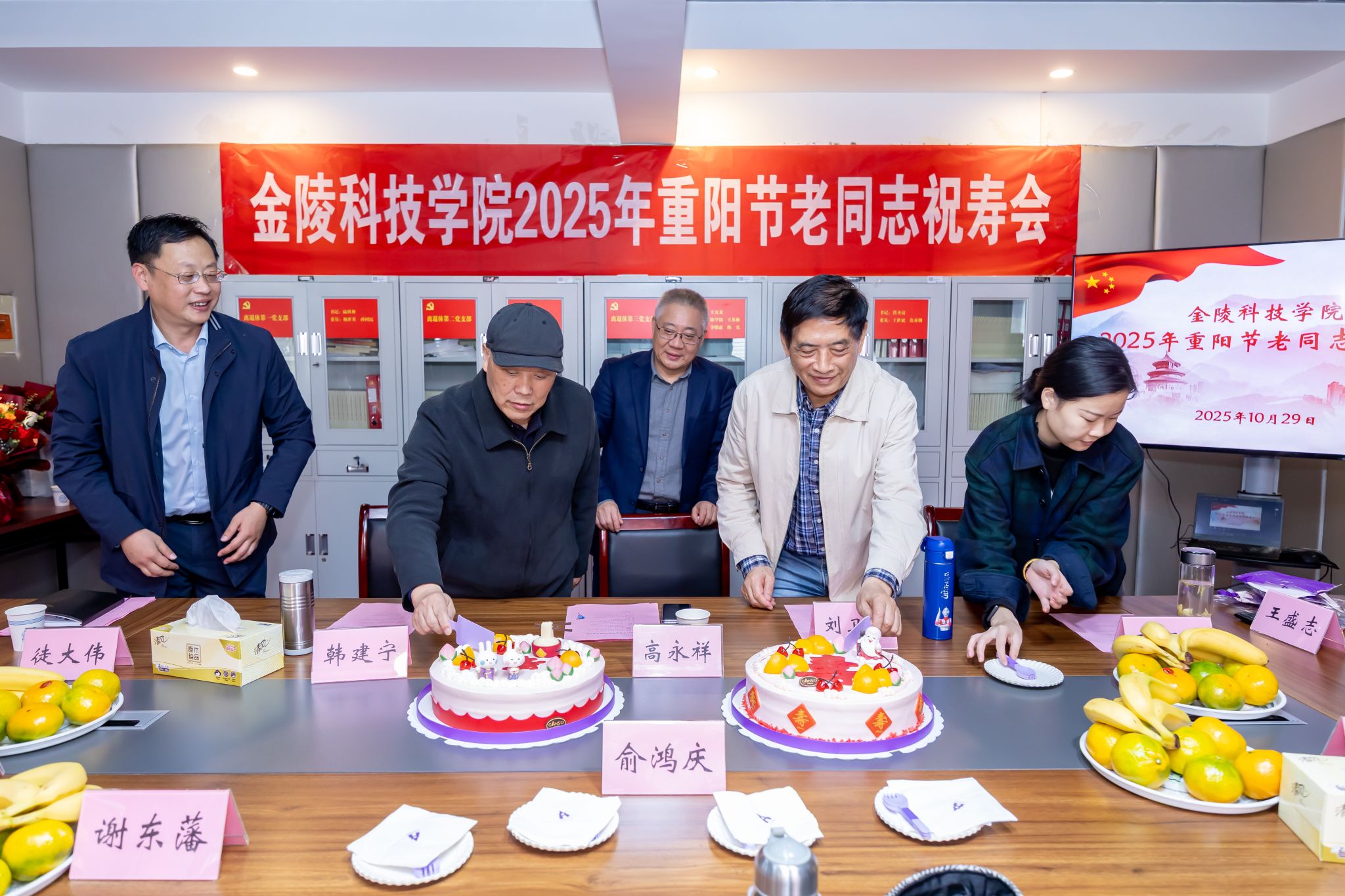 10月29日,,,,,,,,我校在白下校区离退休聚会室举行2025年重阳节老同志祝寿会。。。。。副校长高永祥、校退教协会长刘卫东出席祝寿会,,,,,,,,我校2025年满90、80、70周岁老寿星代表和离退休事情处全体职员加入运动。。。。。