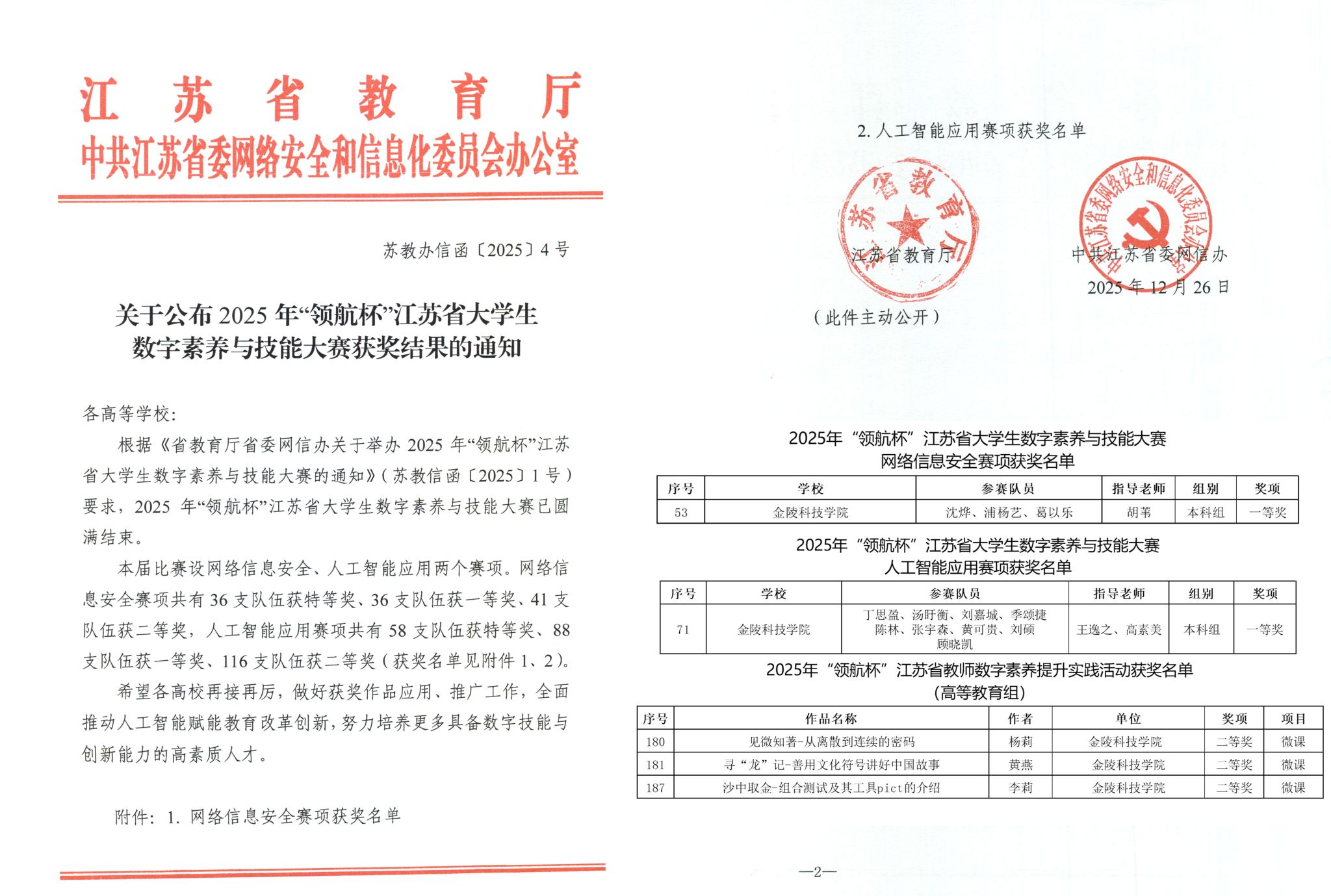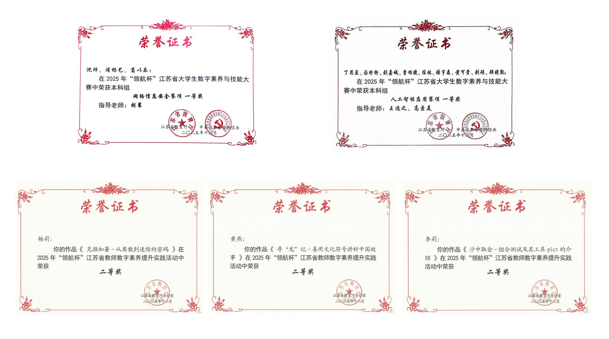 克日,,,,,,在由江苏省教育厅、中共江苏省委网络清静和信息化委员会办公室团结主理的2025年“领航杯”多项大赛中,,,,,,我校师生体现优异,,,,,,荣获一等奖2项、二等奖3项。。。。。其中,,,,,,在江苏省大学生数字素养与手艺大赛网络信息清静赛项中,,,,,,胡苇先生指导的学生团队荣获本科组一等奖;;;;;在江苏省大学生数字素养与手艺大赛人工智能应用赛项中,,,,,,王逸之、高素美先生指导的学生团队荣获本科组一等奖;;;;;在江苏省西席数字素养提升实践运动中,,,,,,杨莉、黄燕、李莉等先生作品划分荣获二等奖各1项,,,,,,充分展现了学校师生在数字素养与手艺人才作育领域的扎实效果。。。。。