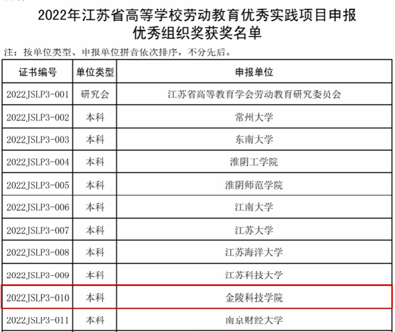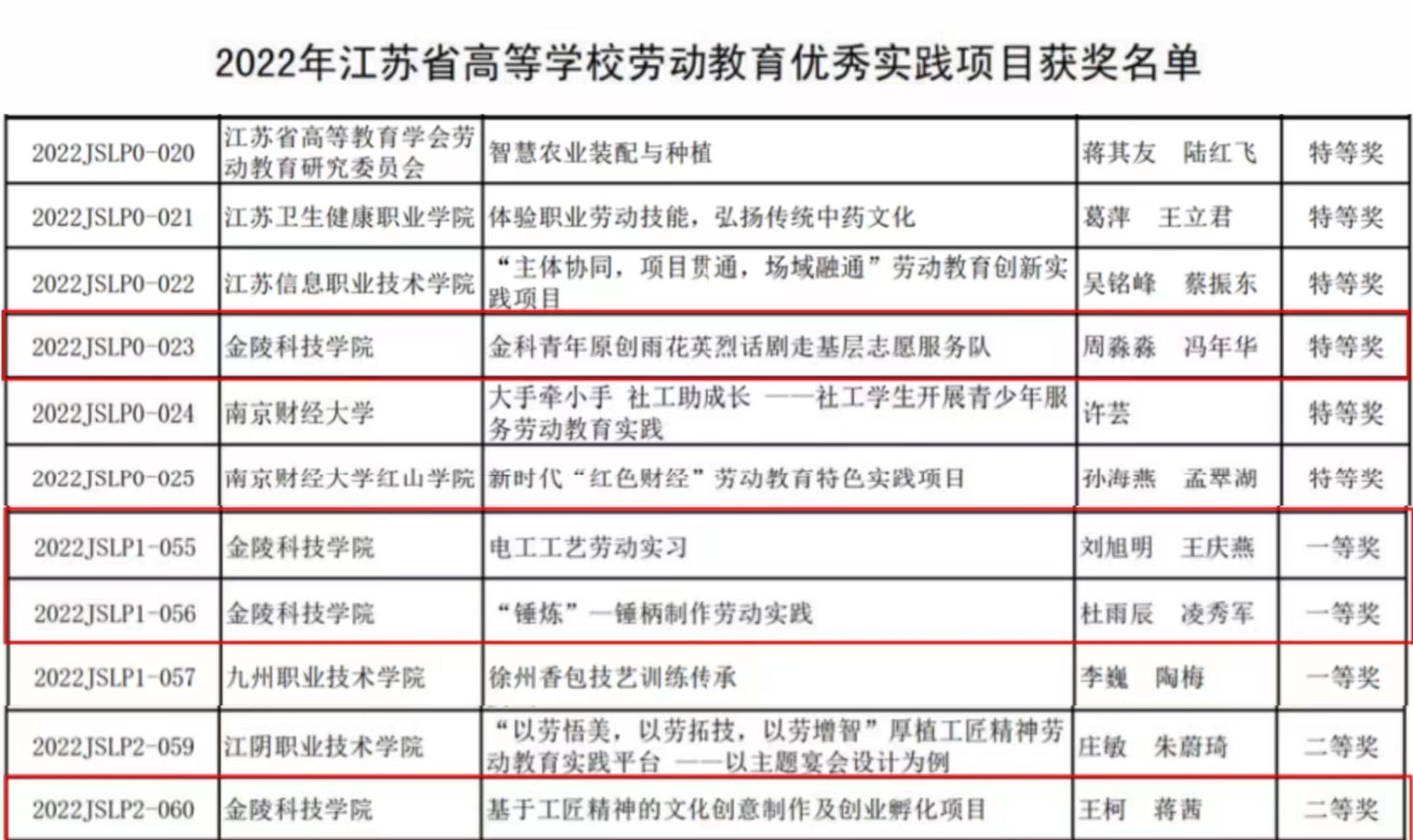 凭证《关于宣布2022年江苏省高等学校劳动教育优异实践项目评选效果的通知》(苏高教会﹝2023﹞5号)文件,,,,,,,我校择优报送的4个项目所有获奖,,,,,,,其中特等奖1个、一等奖2个、二等奖1个。。。。。由于项目评选组织规范、效果优异,,,,,,,学校同时被授予“优异组织奖”。。。。。