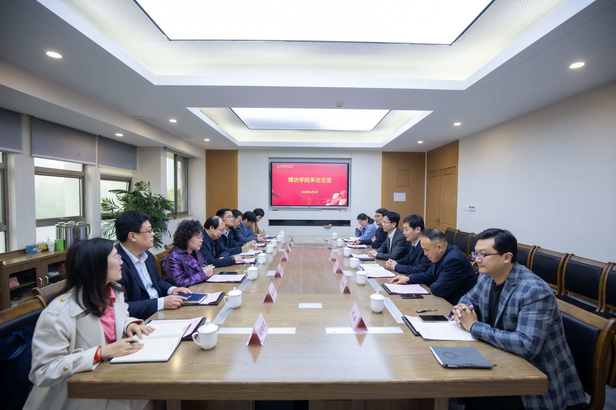 4月6日下昼,,,,,,,,潍坊学院副校长李英德率领部分职能部分和二级学院认真人来我校调研交流。。。。。。。