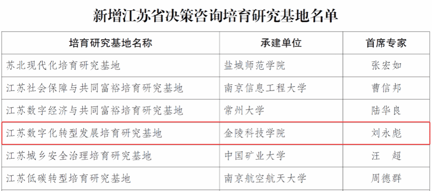克日,,,,,凭证《江苏省“十四五”哲学社会科学协同立异妄想》等安排,,,,,经果真招标、专家两轮评审、省社科联党组研究、公示,,,,,我校刘永彪教授作为首席专家申报的“江苏数字化转型生长研究基地”获批“江苏省决议咨询培育研究基地”,,,,,成为我校首个省级决议咨询研究基地。。。。。。。该研究基地由我校团结中央党校(国家行政学院)公共治理教研部、江苏省大数据治理中心的专家团队团结申报,,,,,旨在为打造“数字江苏”和建设“强富美高”新江苏提供智力支持和资政效劳。。。。。。。