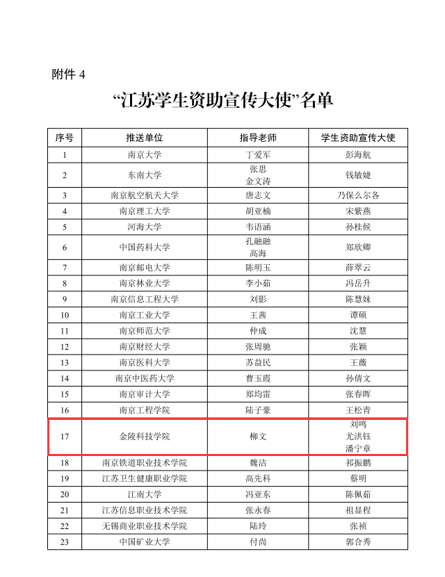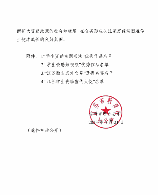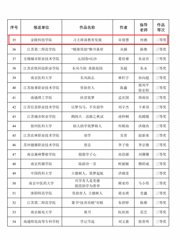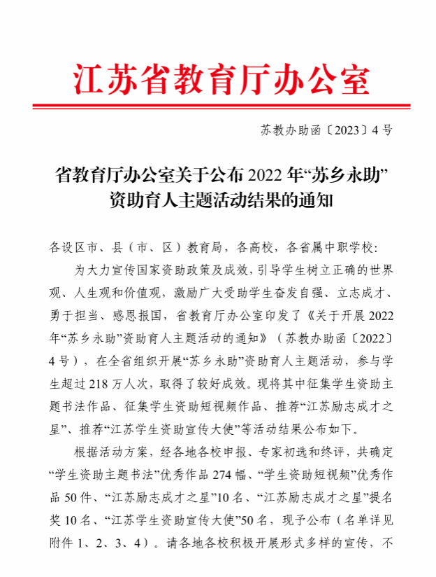 克日,,,,,,,,江苏省教育厅宣布了2022年“苏乡永助”资助育人主题运动效果。。。。。。。。我校修建工程学院宋倩慧同砚书法作品《习近平总书记谈教育生长》荣获高校组软笔二等奖(指导先生:何湘),,,,,,,,国际教育学院的刘鸣、尤洪钰、潘宁章团队获评“江苏学生资助宣传大使”(指导先生:柳文)。。。。。。。。