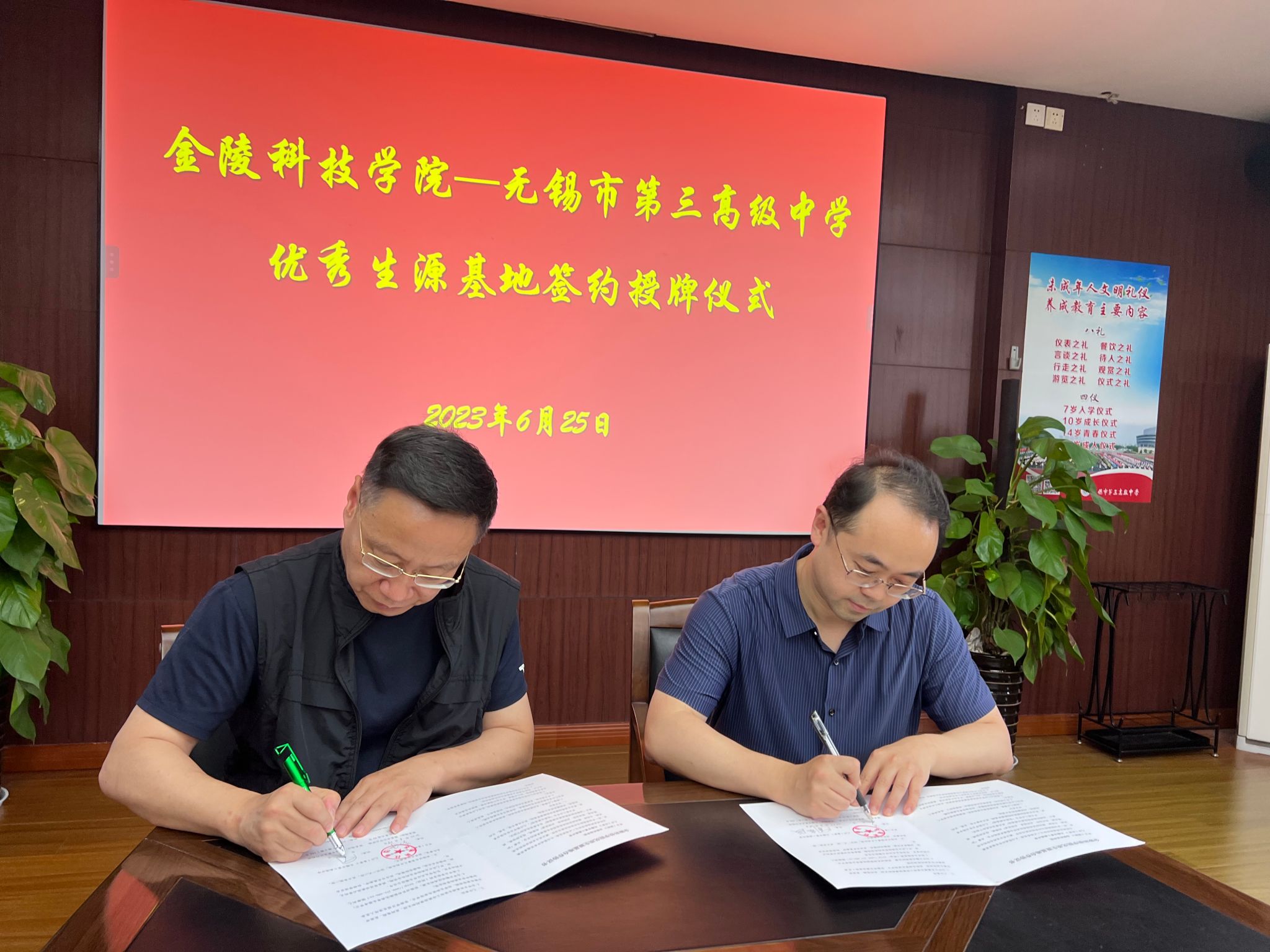 6月25日下昼,,,,,,我校与无锡市第三高级中学的优质生源基地签约授牌仪式在无锡市第三高级中学举行。。。。。。。。校党委副书记单晓峰、网络与通讯工程学院党委书记陈健、无锡市第三高级中学副校长周宏俊、教务处副主任吉缪明加入了仪式。。。。。。。。