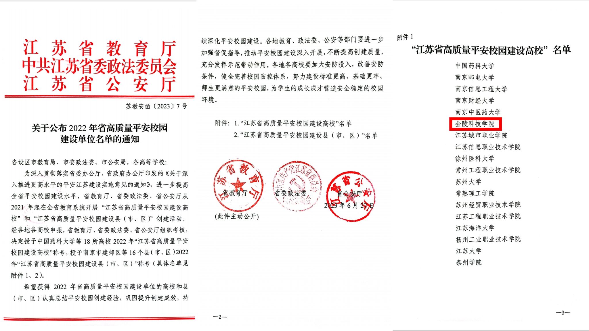 克日,,,,,,,省教育厅、省委政法委、省公安厅团结宣布2022年省高质量平安校园建设单位名单,,,,,,,我校被授予“江苏省高质量平安校园建设高校”称呼。。。。。。。此次共有18所高校荣获此称呼。。。。。。。