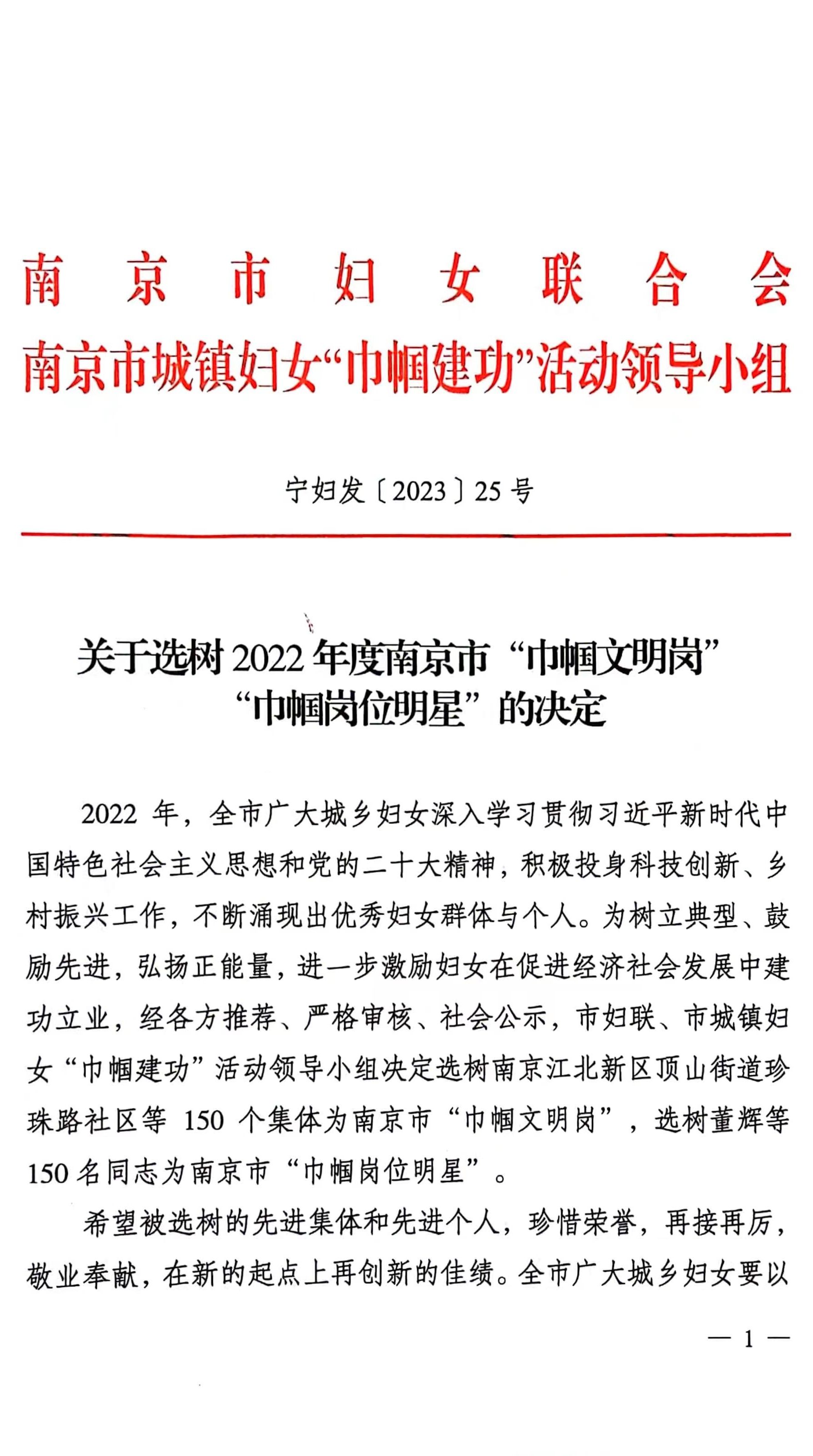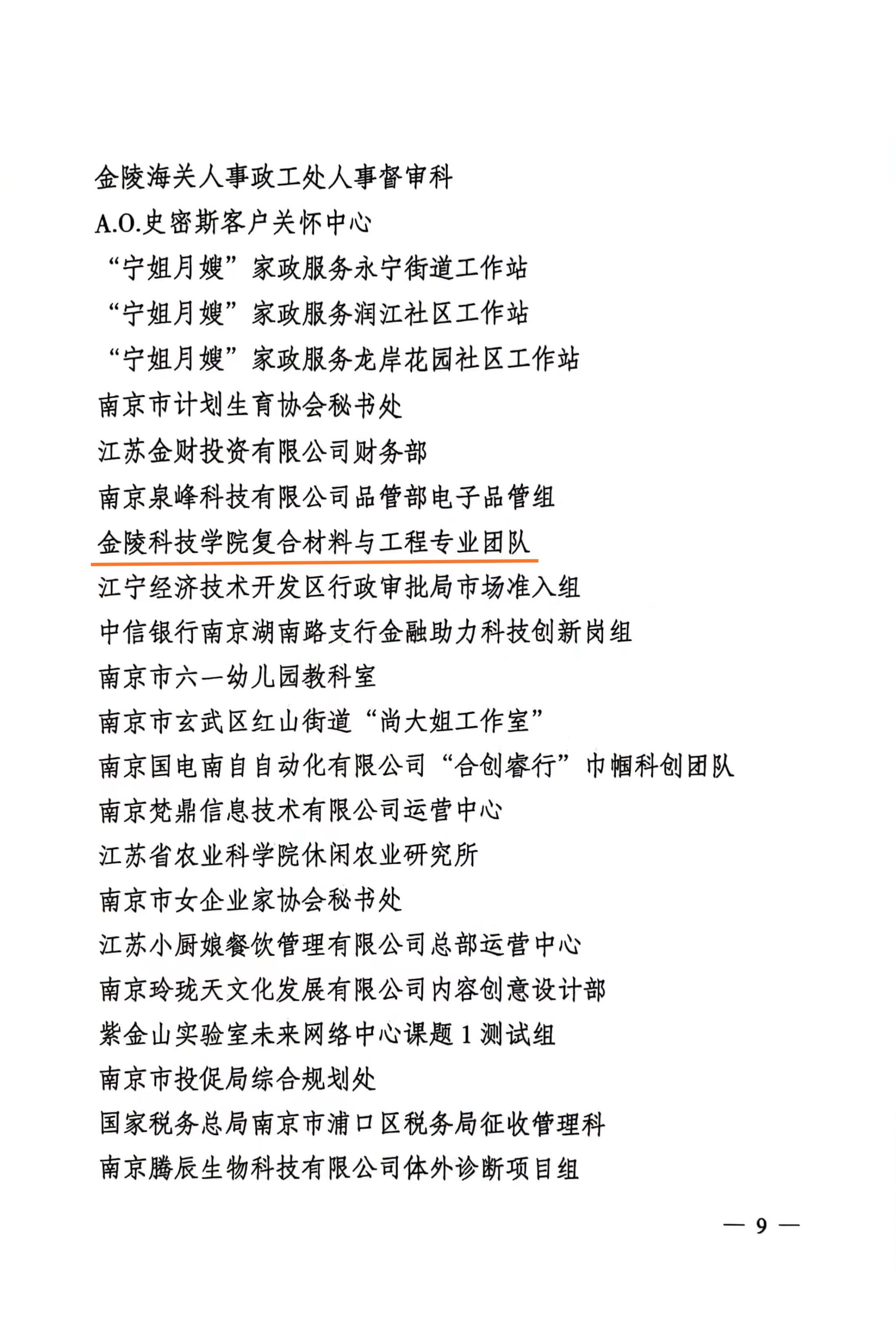 克日,,,,,,南京市妇女团结会印发《关于选树2022年度南京市“巾帼文明岗”“巾帼岗位明星”的决议》(宁妇发〔2023〕25号),,,,,,我校质料工程学院复合质料与工程专业团队获“巾帼文明岗”声誉称呼。。。。。。。。