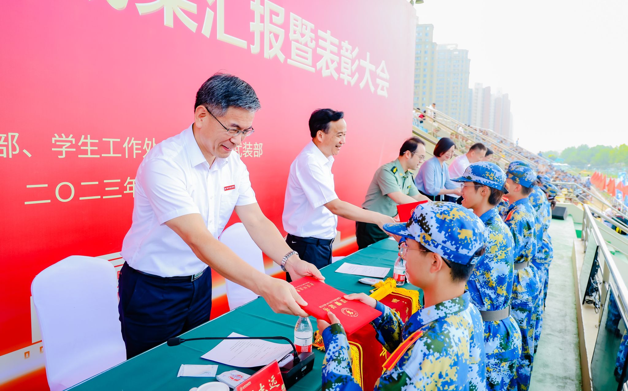 9月27日,,,,,,,,我校2023级本科新生军训效果汇报暨表扬大会在江宁校区北运动场举行。。。。。校党委书记刘志远、校长刘永彪、党委副书记单晓峰、副校长张燕、副校长倪杰、副校长高永祥、纪委书记王延光、副校长顾晓燕、副校长叶智锐,,,,,,,,承训步队首长,,,,,,,,相关职能部分认真人、各二级学院党政认真人、新生向导员和班主任、2023级全体军训团成员加入大会。。。。。单晓峰主持大会。。。。。