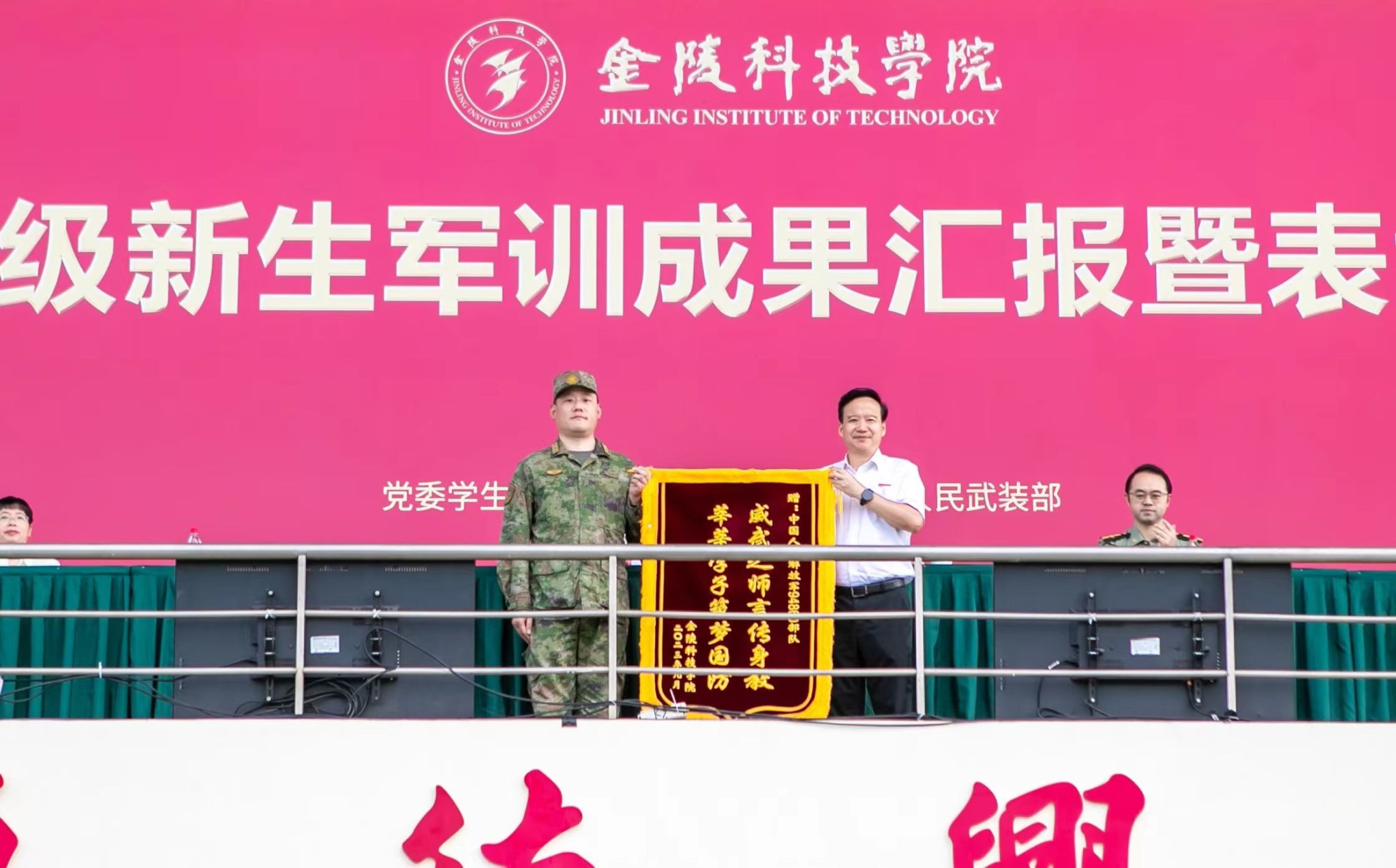 表扬环节,,,,,,,,刘永彪向承训的94860步队赠予锦旗,,,,,,,,顾晓燕宣读《关于表扬看个球app官网二〇二三级学生军训“优异学员”的决议》,,,,,,,,人文学院新生段雨君作为优异学员代表上台讲话。。。。。