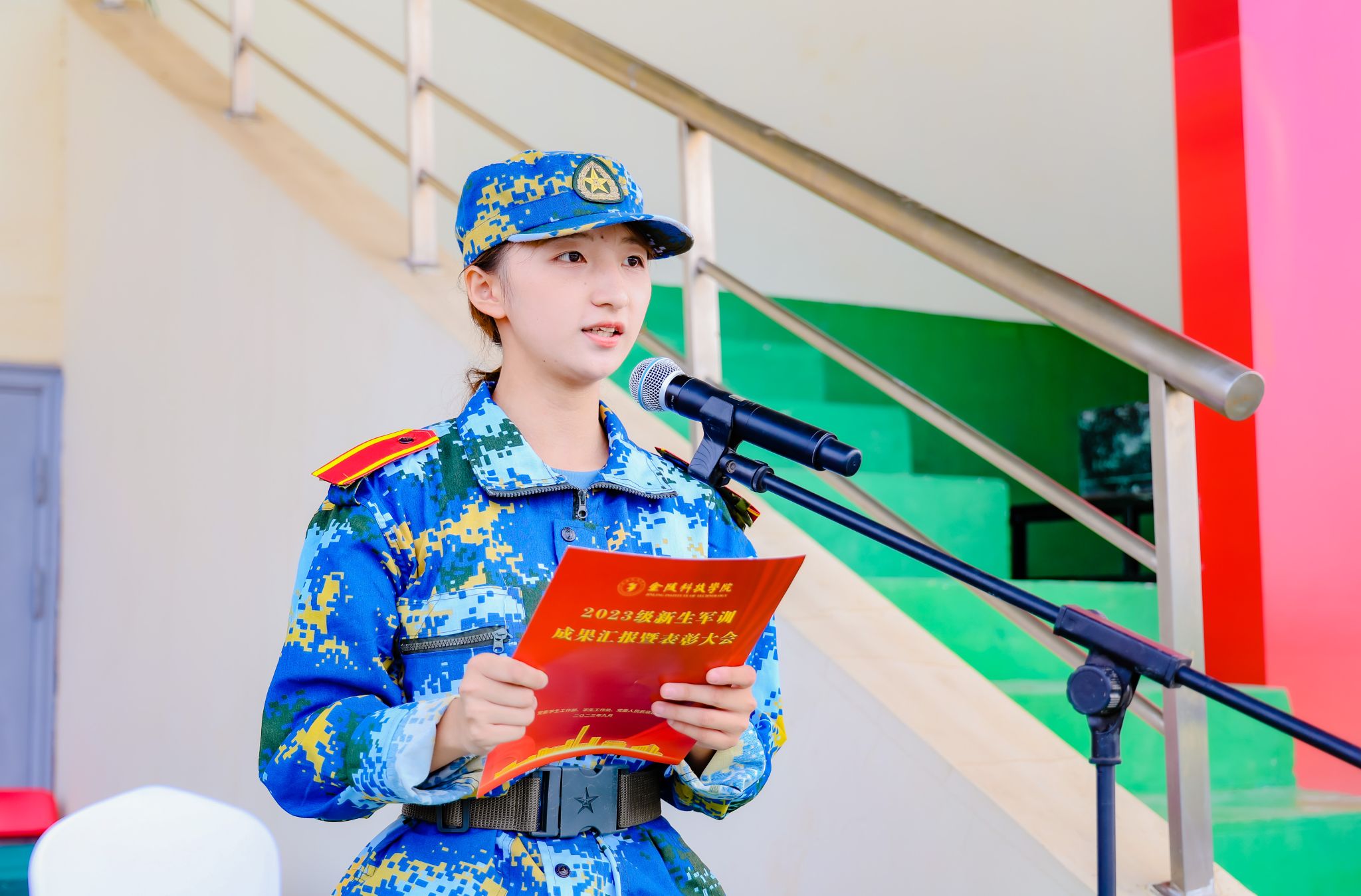 首先举行升国旗仪式,,,,,,,,五星红旗在国旗班的护卫下,,,,,,,,陪同着雄壮的国歌声冉冉升起。。。。。随着刘志远下达“最先”指令,,,,,,,,军训汇报正式拉开序幕。。。。。排列式上,,,,,,,,各学院方阵口号响亮,,,,,,,,程序整齐,,,,,,,,展示出优异的军事训练效果。。。。。1200名金科学子组成的方阵转变出“2023”“新生”“汇报”“演出”及倒计时的字样,,,,,,,,拉开了演出的序幕。。。。。擒敌拳、搏击术、匕首操,,,,,,,,一招一式行云流水,,,,,,,,一进一退攻守兼备,,,,,,,,极具视觉攻击。。。。。“陶醉式”战术演出使人身临其境,,,,,,,,模拟战场狼烟滔滔,,,,,,,,将军训效果汇报演出推向热潮。。。。。来自商学院的8名退役复学学生代表向母校报到,,,,,,,,充分展示了退役不褪色、换装不换志的武士继续。。。。。