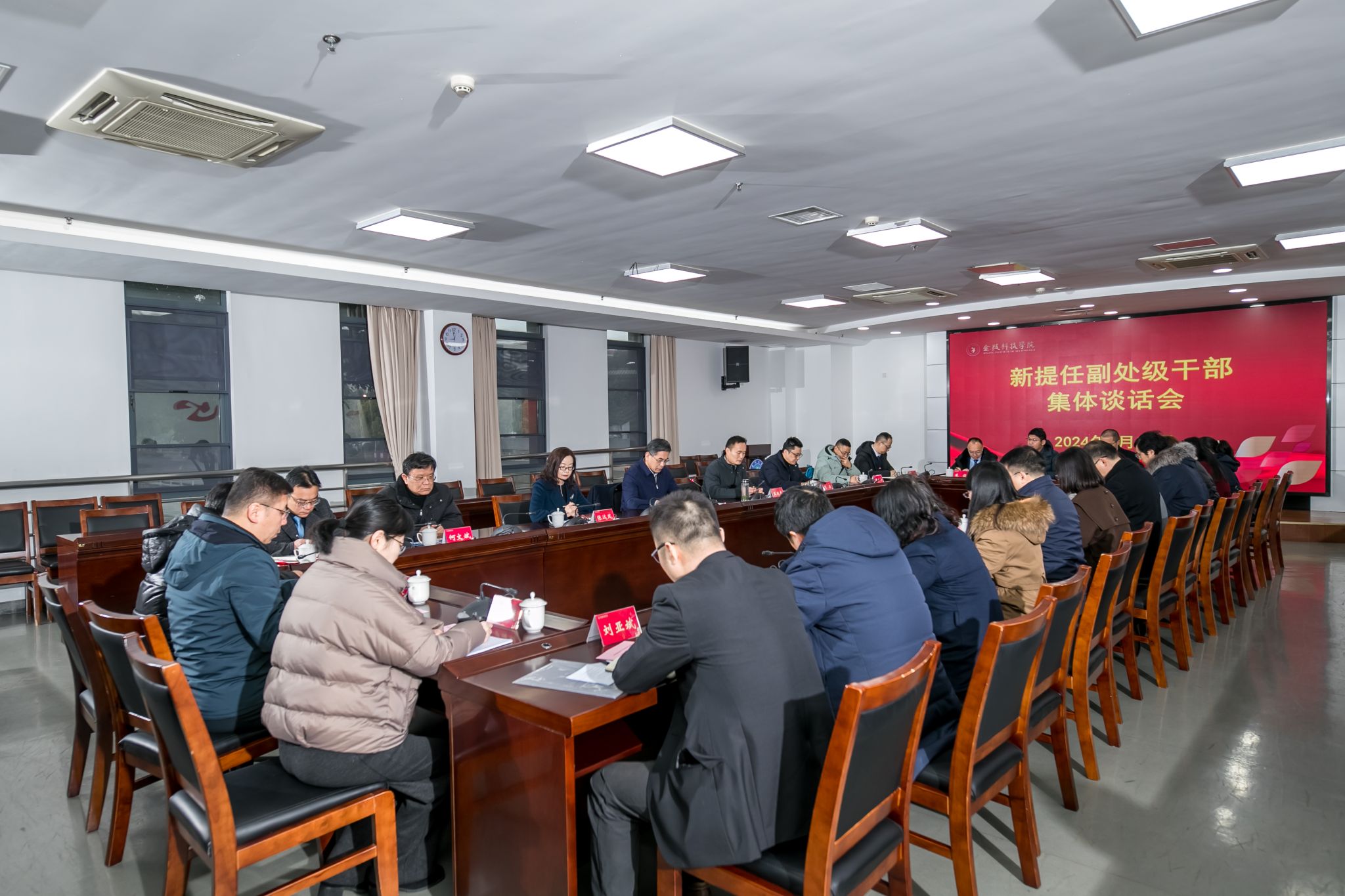 2月28日上午,,,,,,,,校党委举行新提任副处级干部任前整体谈话会。。。。。。校党委书记刘志远主持聚会并讲话。。。。。。校党委常委、纪委书记王延光出席聚会。。。。。。校党委常委、组织部部长张远凤,,,,,,,,校纪委副书记、纪委办主任周骏和新提任的22名副处级干部加入聚会。。。。。。