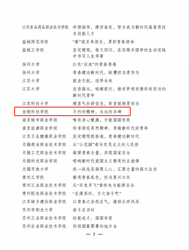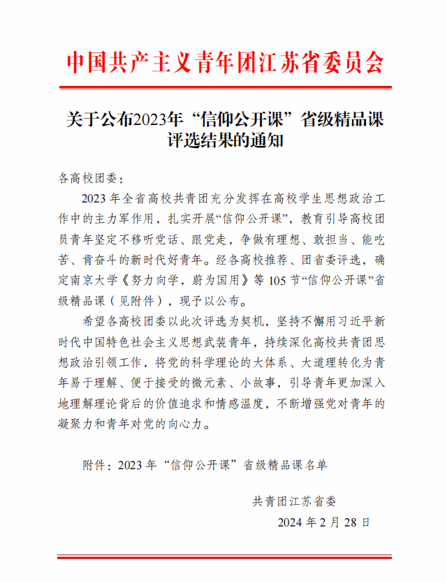 克日,,,,,,,,共青团江苏省委宣布2023年“信仰果真课”省级精品课评选效果,,,,,,,,我校《不朽的精神,,,,,,,,永远的丰碑》课程获评省级精品课。。。。。。。。