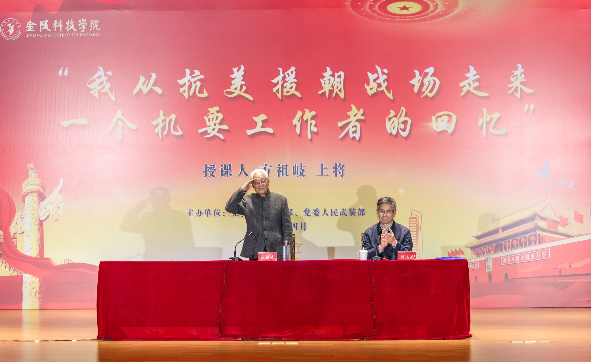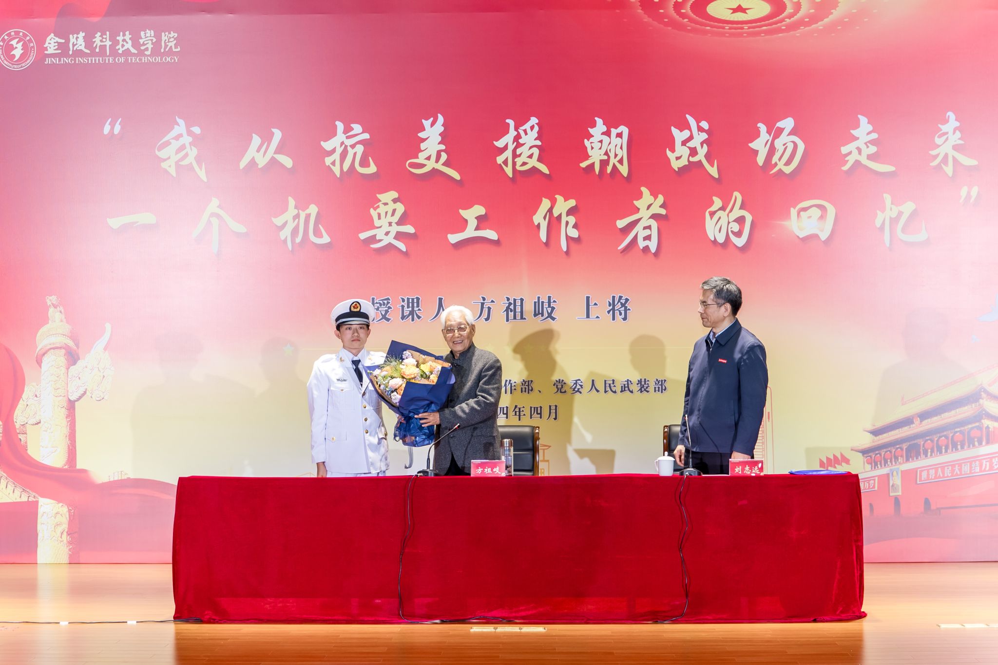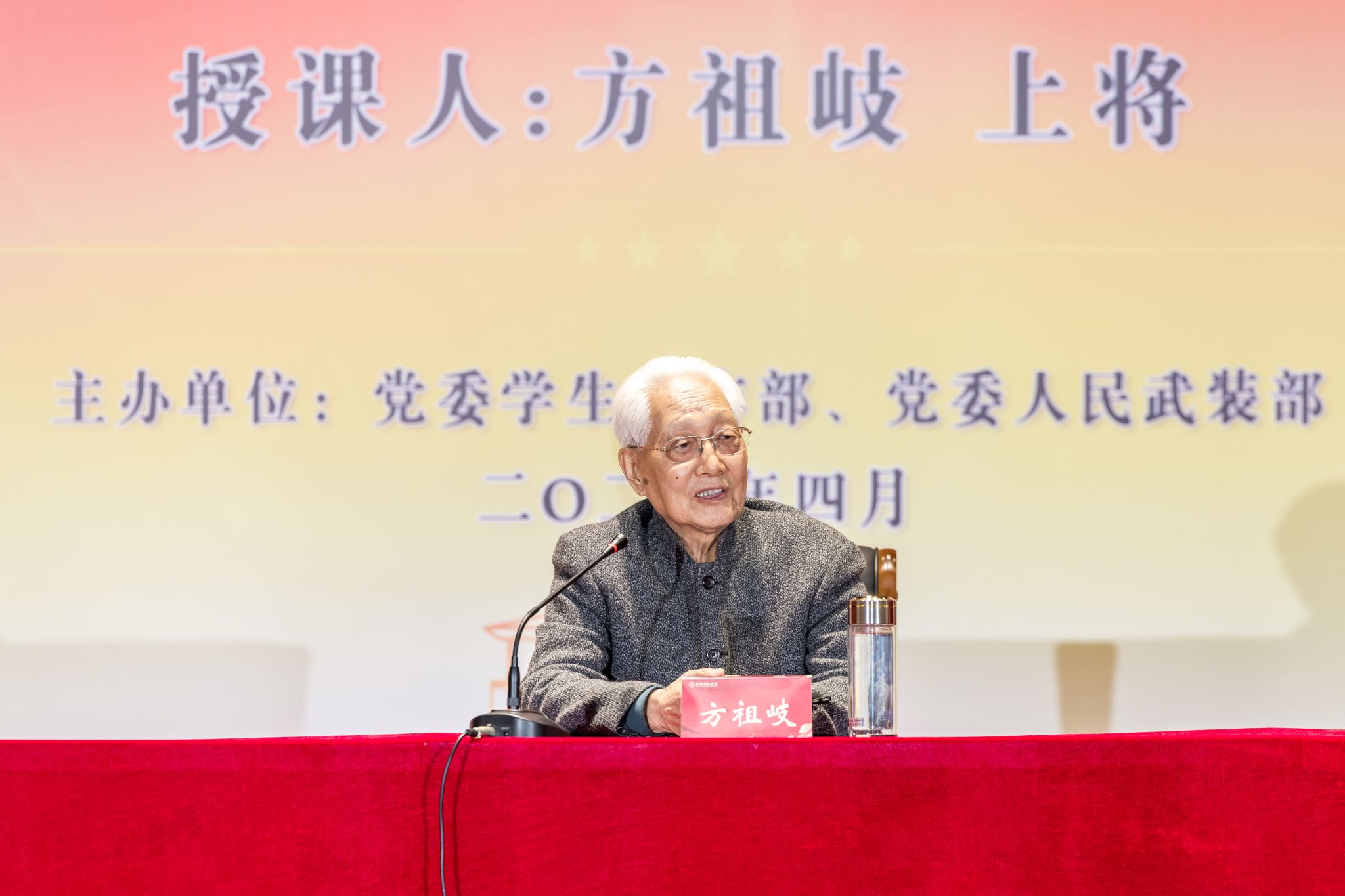 4月17日,,,,,原中国人民解放军高级将领方祖岐上未来我校交流并为师生教学“信仰果真课”。。。。。。。校党委书记刘志远、校长刘永彪出席运动,,,,,党委办公室、党委组织部、党委宣传部、校长办公室、党委学生事情部、党委人民武装部主要认真人,,,,,以及师生代表等千余人加入运动。。。。。。。