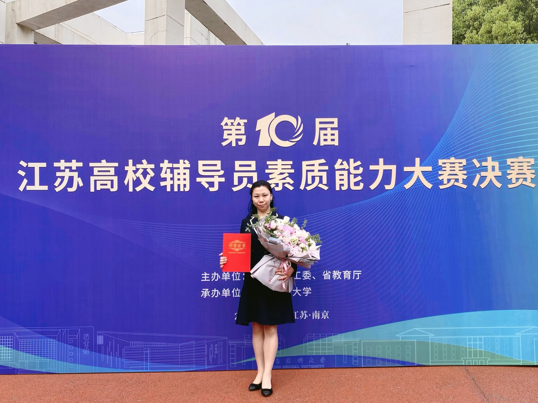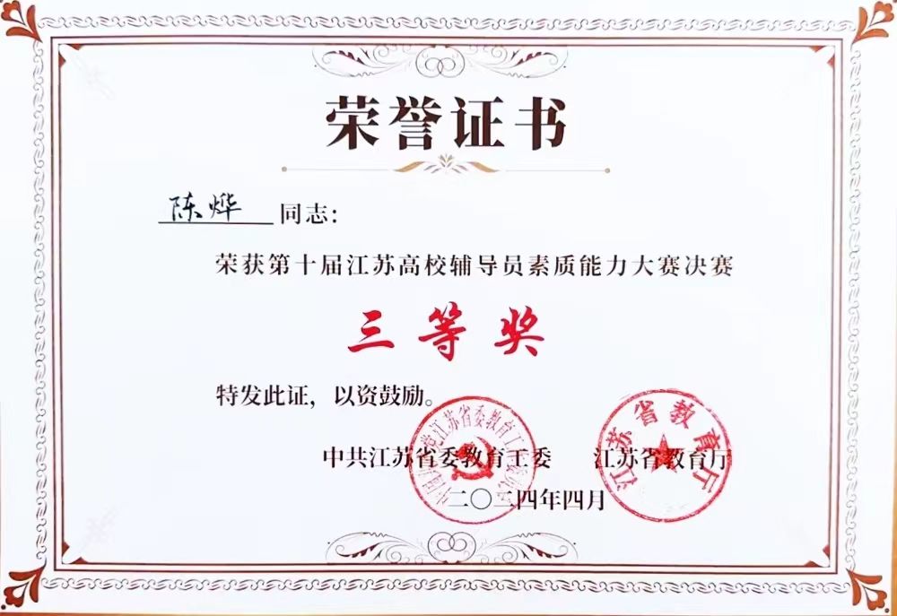 4月19日至20日,,,,,,第十届江苏高校向导员素质能力大赛决赛在南京医科大学落下帷幕,,,,,,全省7个研修基地复赛推选出的40位选手同台竞技。。。。。。。经由两天强烈比拼,,,,,,我校向导员陈烨荣获大赛三等奖,,,,,,这是我校向导员首次进入省赛决赛,,,,,,刷新了我校参赛以来的最好效果。。。。。。。