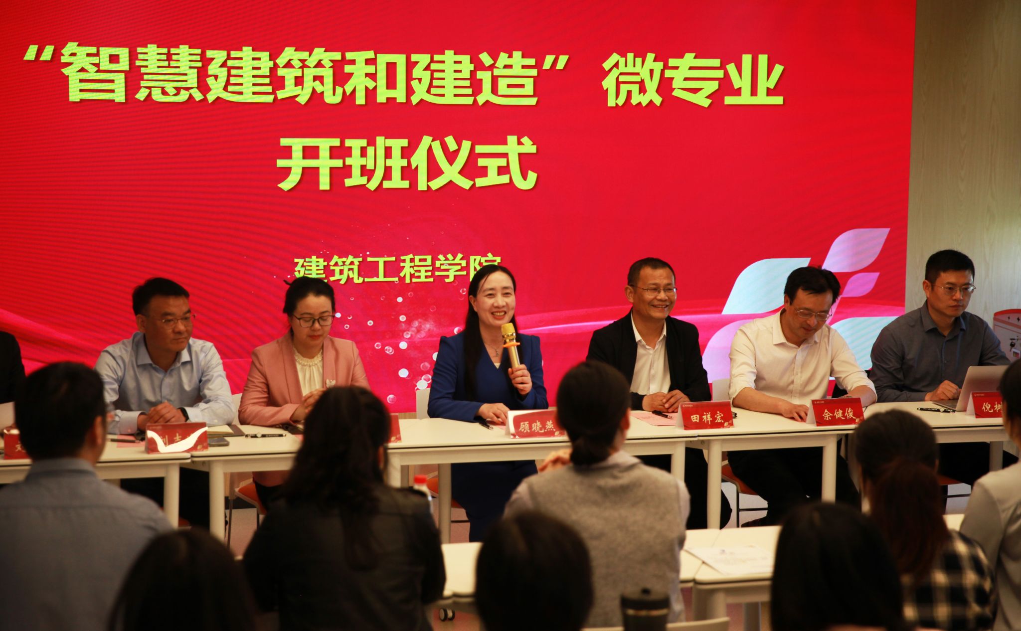 4月24日,,,,,,,,教务处组织修建工程学院召开智慧修建和制作微专业开班仪式。。。。。。。副校长顾晓燕及教务处、修建工程学院相关职员加入开班仪式,,,,,,,,开班仪式约请南京工业大学修建设计研究院副院长佘健俊和我校工业教授、南京慧筑信息手艺研究院有限公司总司理倪树新作报告。。。。。。。