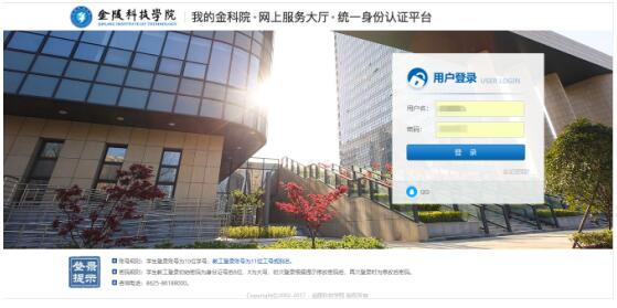 在浏览器地点栏输入学校域名/_mediafile/jlkj/,,,,,,,,点击 “我的金科院”进入网上效劳大厅,,,,,,,,输入用户名和密码点击登录。。。。。