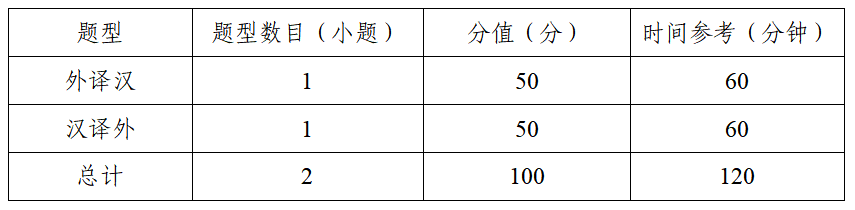 笔译试卷满分为100分,,,,,,,时间为120分钟,,,,,,,共2种题型2道题,,,,,,,所有为主观题;;;;;选手可使用中译外、外译中字典各1本。。。。。。。。