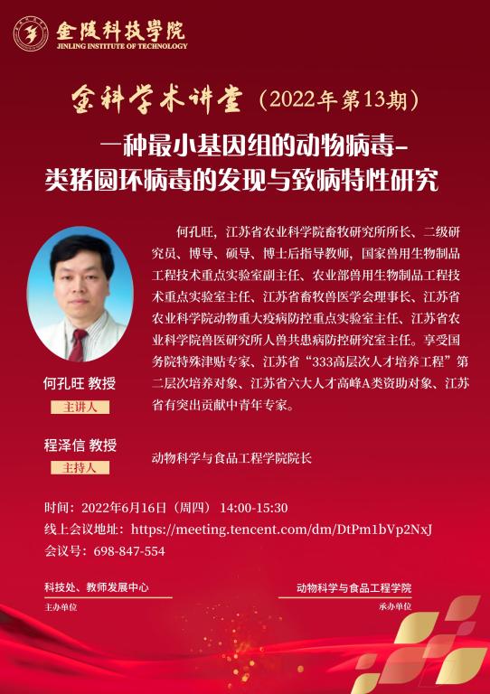 关于举行线上“金科学术课堂—一种最小基因组的动物病毒—类猪蕴厥狻毒的发明与致病特征研究”学术报告的通知