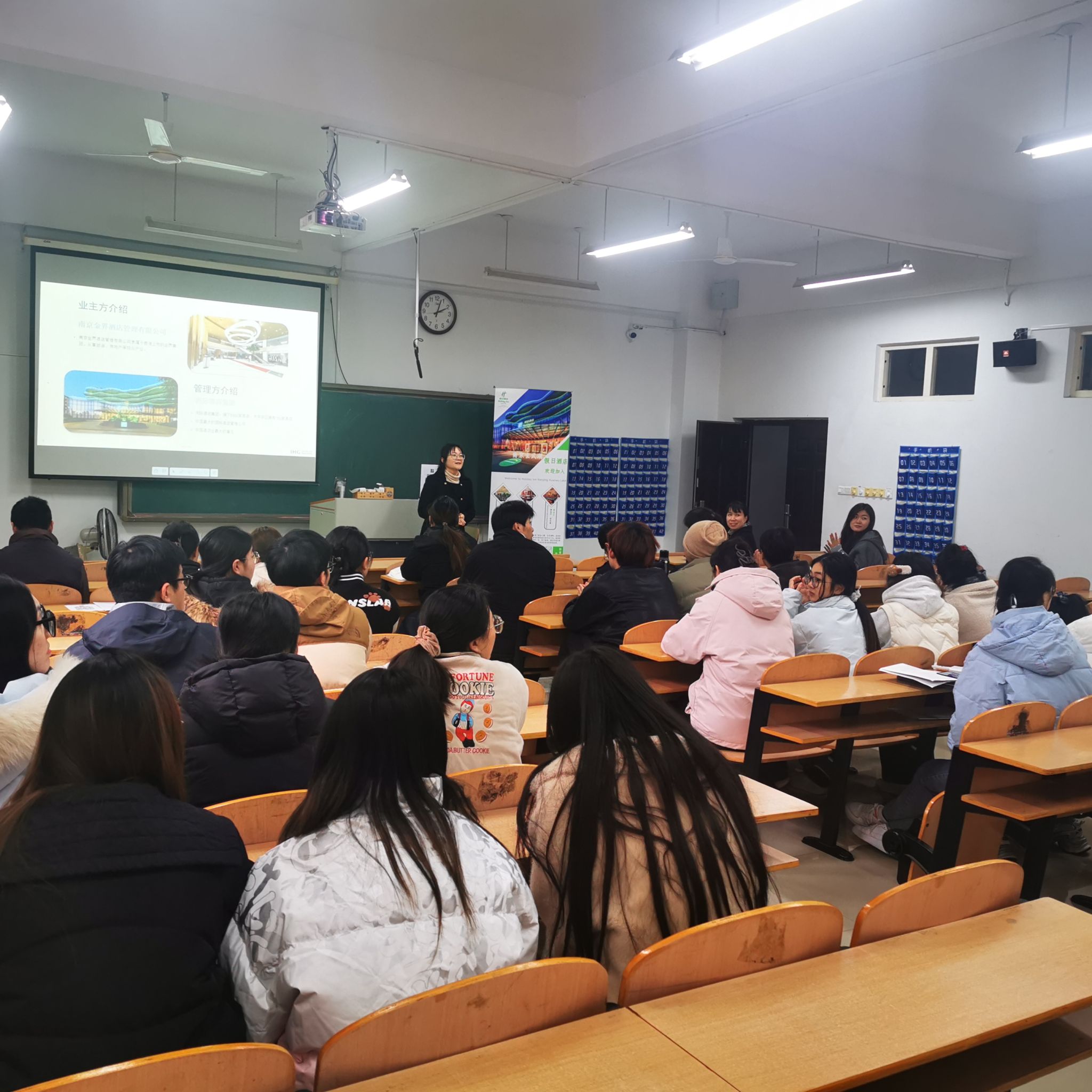 12月11日下昼,,,,,,,,在幕府校区图教楼203,,,,,,,,人文学院约请南京玄武湖沐日旅馆举行了旅游治理专业招聘宣讲会。。。。。。。。本次宣讲会约请南京玄武湖沐日旅馆人力资源部总监何娟、薪酬部司理陈静秋、培训部司理黎晓愿主讲,,,,,,,,旅游治理专业80余名同砚加入了宣讲会。。。。。。。。
