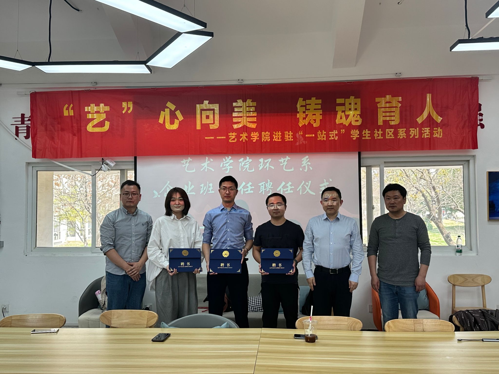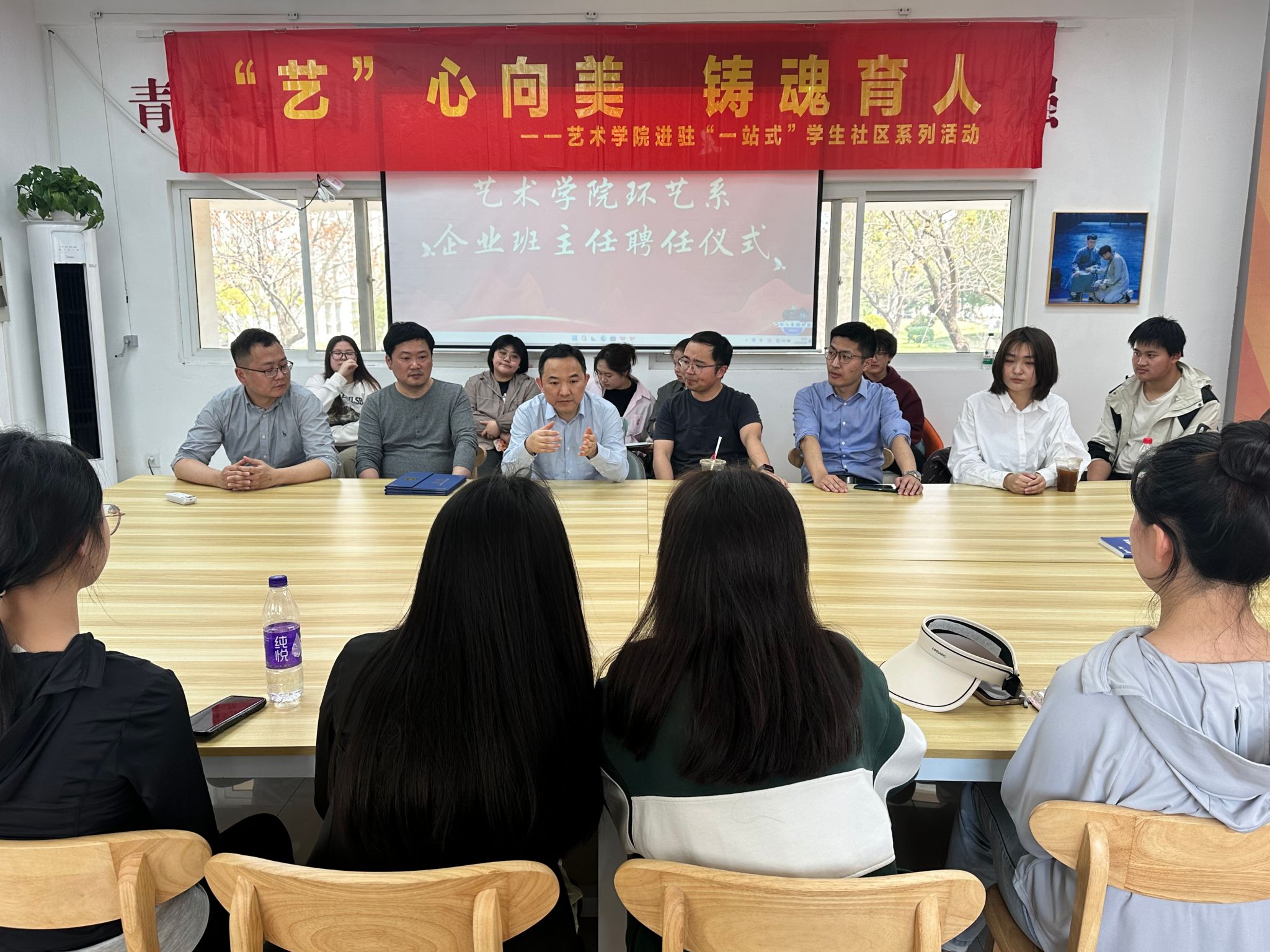 为深化产教融合,,,,,立异人才作育机制,,,,,艺术学院于南区08一站式社区举行环艺系企业班主任聘用仪式。。。。。。。。学院党委副书记鲍锐,,,,,学工办主任丛扬子,,,,,环艺系主任徐晶、副主任赵子君,,,,,南京薄幕软件科技有限公司总监任远东(在宁校友),,,,,意趣数字科技有限公司首创人周炎、高吟及环艺系情形设计、艺术与科技学生代表加入了此次运动。。。。。。。。