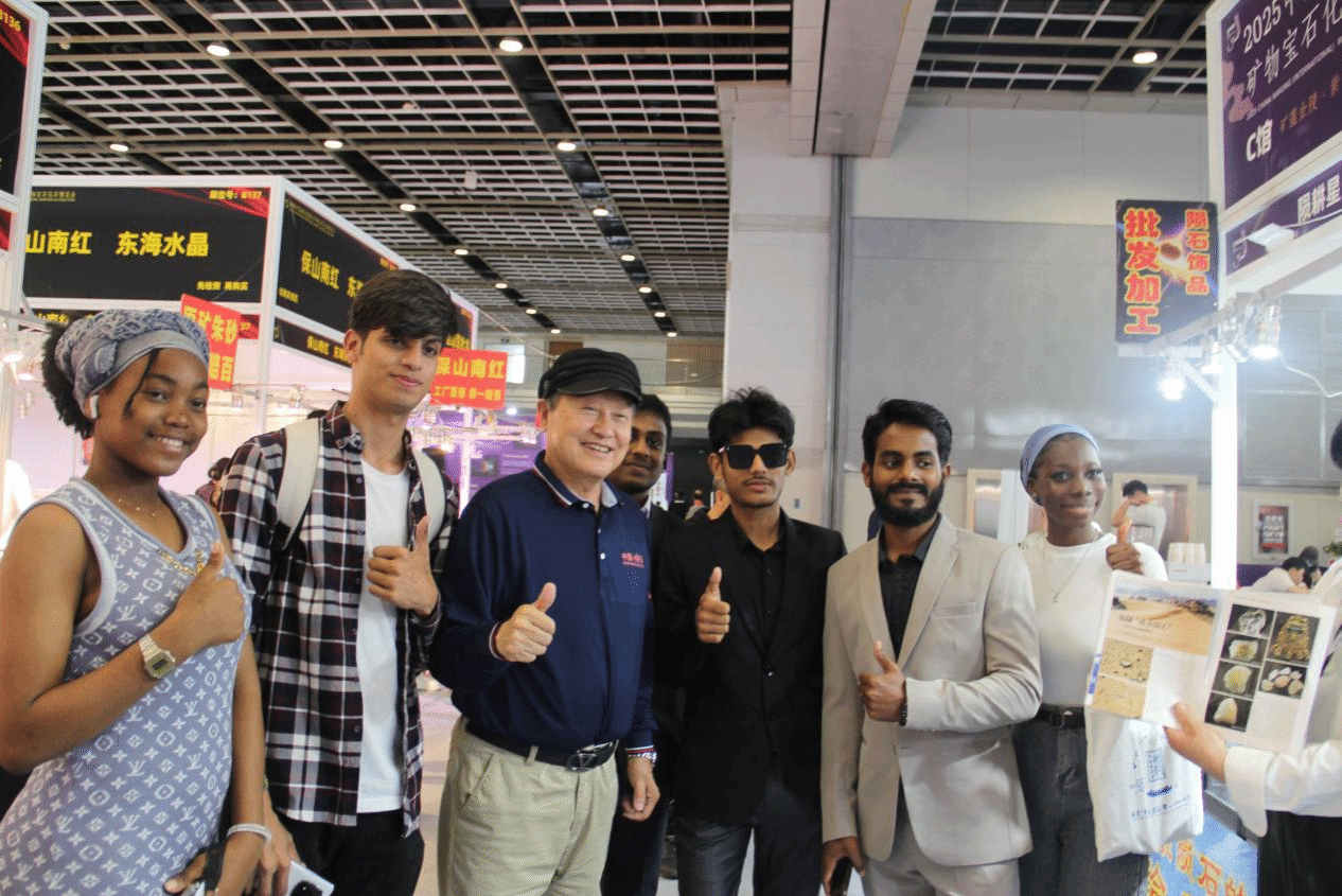 留学生们在解说员的向导下旅行了展览会现场国际矿晶区、珠宝区、化石区、陨石区等八大展示区域,,,,,闲步于“天地共识”陨石特展区,,,,,赞叹“手可摘星辰”的巧妙体验;;;;;;流连于“深潜入,,,,,大地的紫色星云”紫色矿物主题区,,,,,赞叹“镇馆之宝”——紫晶“宝船”的巧夺天工;;;;;;彷徨于陶醉式研学的科普运动区,,,,,叹息科学与艺术融合的浑然天成;;;;;;徘徊于“矿蕴未来”的知识海洋,,,,,称叹数字手艺与文化遗产融合的立异撒播。。。。。。。