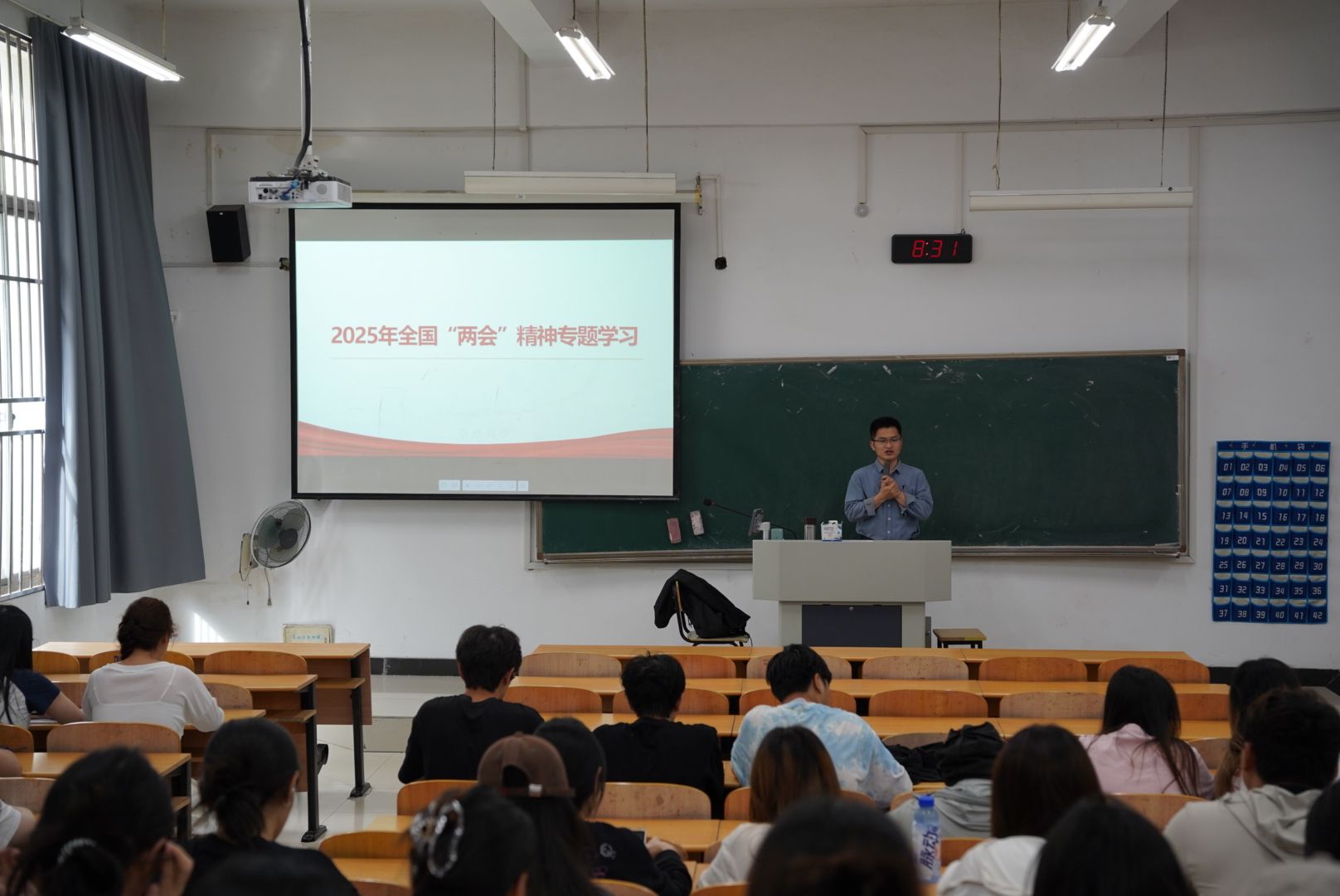 5月18日上午,,,,,,,动漫学院在勤业楼1103课堂开展了本学期第一期、第二期形势与政策讲座。。。。。。。讲座划分以“2025年天下‘两会’精神学习解读”、“2024年美国大选对中美关系的影响”为主题,,,,,,,由马克思主义学院朱林先生主讲。。。。。。。学院21、22级同砚加入了讲座。。。。。。。
