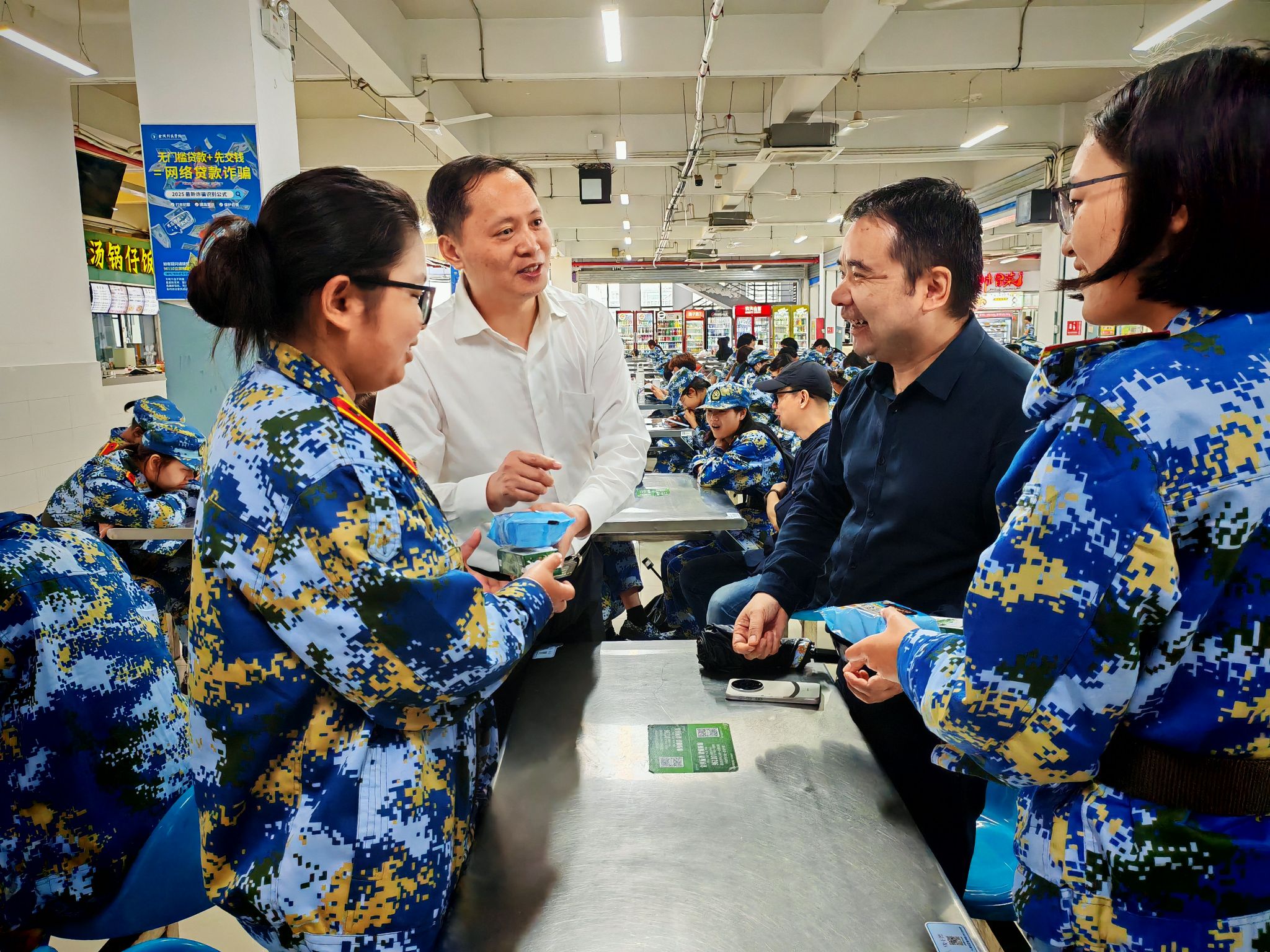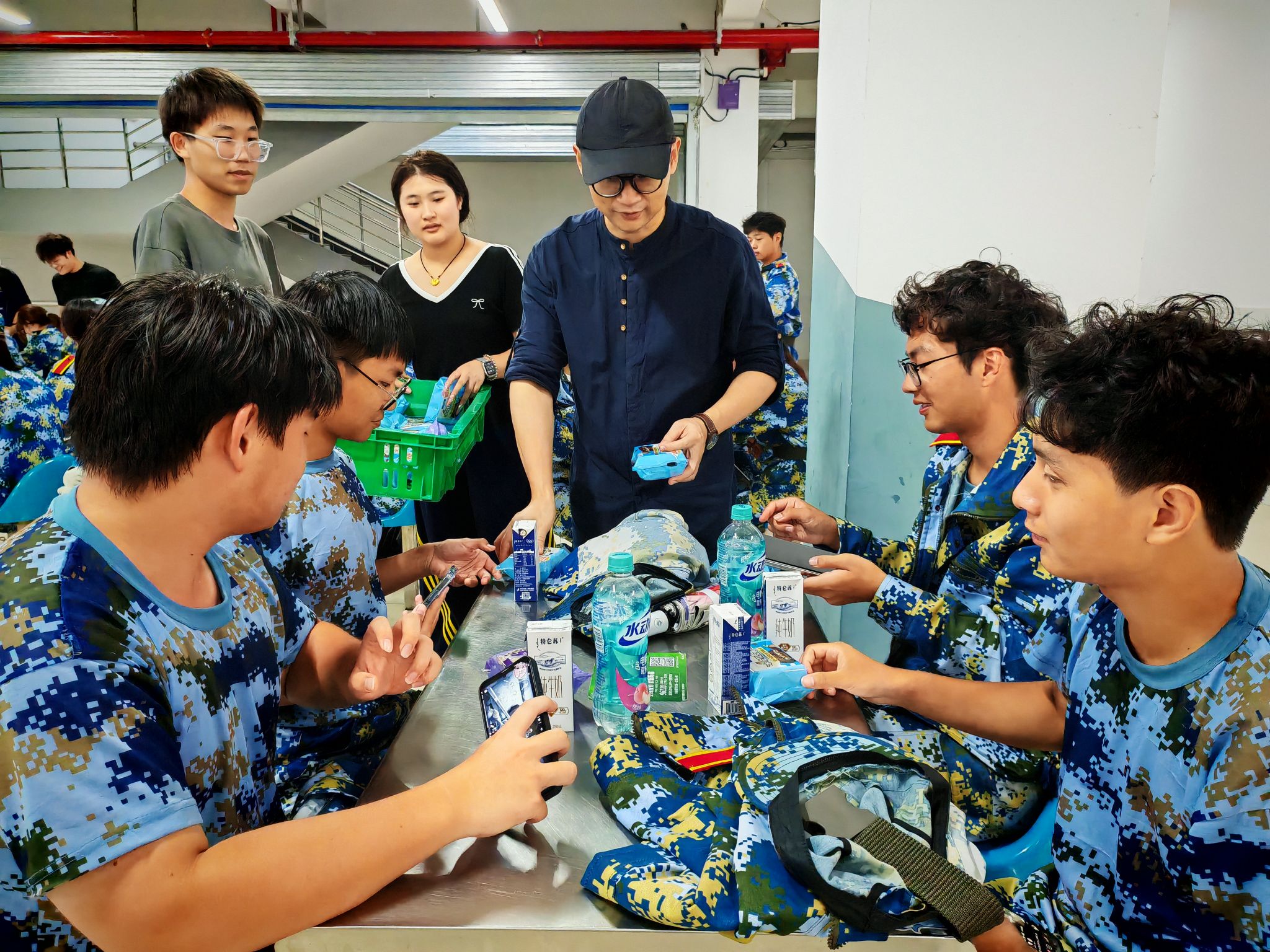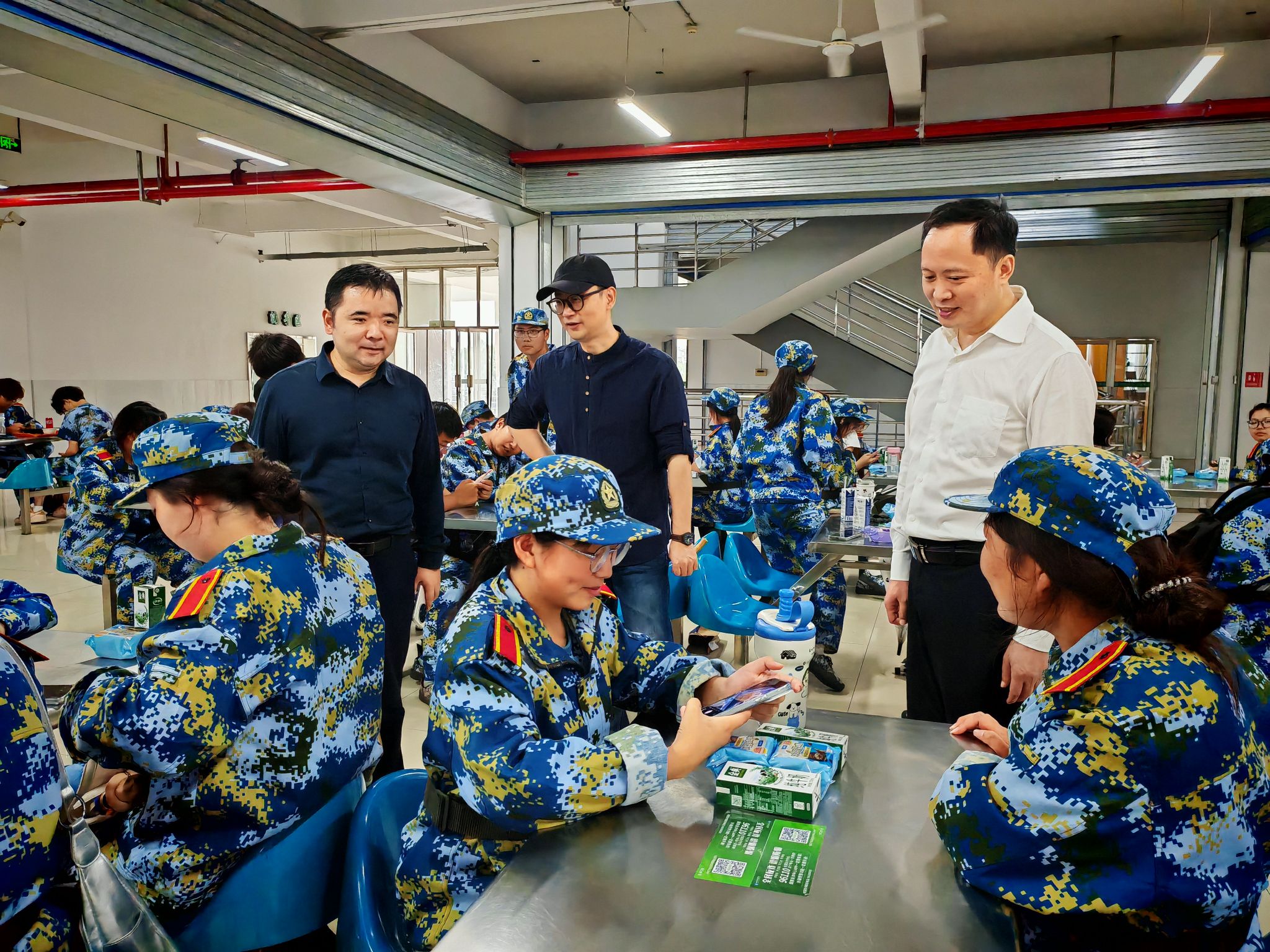 9月25日下昼,,,,,,,,秋雨绵绵,,,,,,,,动漫学院全心组织了一场温馨的新生军训慰问运动。。。。。。。。学院党总支部书记葛维东、院长王贤波、副院长王柯、全体向导员及新生向导员助理一行,,,,,,,,专程前往南区食堂,,,,,,,,探望慰问因大雨暂时调解训练妄想、在此休整的2025级参训新生,,,,,,,,为他们送去学院的深切眷注和殷切勉励。。。。。。。。