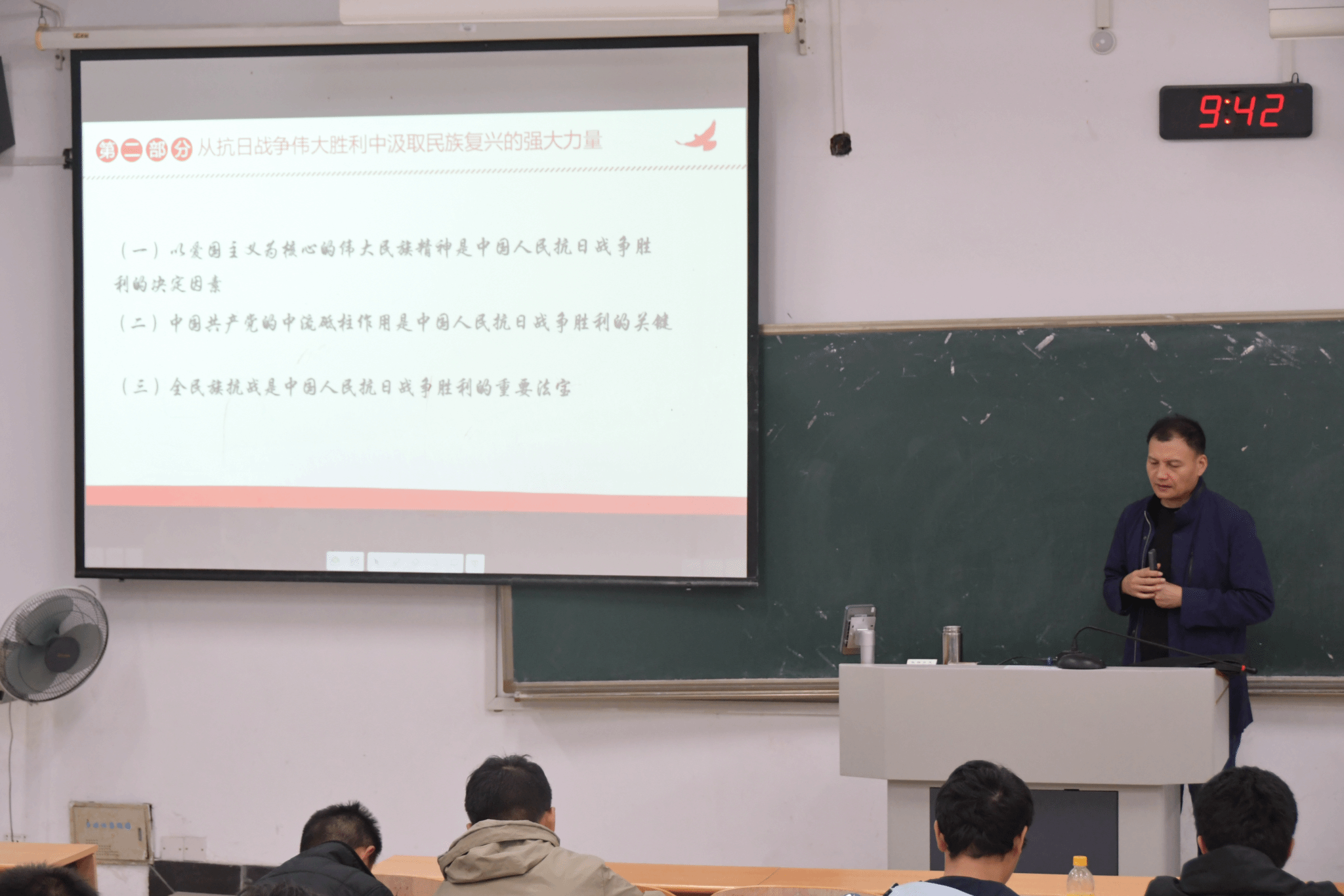 10月25日上午,,,,,,网络清静学院约请了马克思主义学院周汝江先生在勤业楼1103课堂举行了形势与政策专题讲座。。。。。。此次讲座旨在资助学生相识目今海内形状势与政谋划态,,,,,,增强社会意识与社会责任感。。。。。。本次讲座的主题为:“弘扬伟大抗战精神·凝聚奋进再起实力”。。。。。。