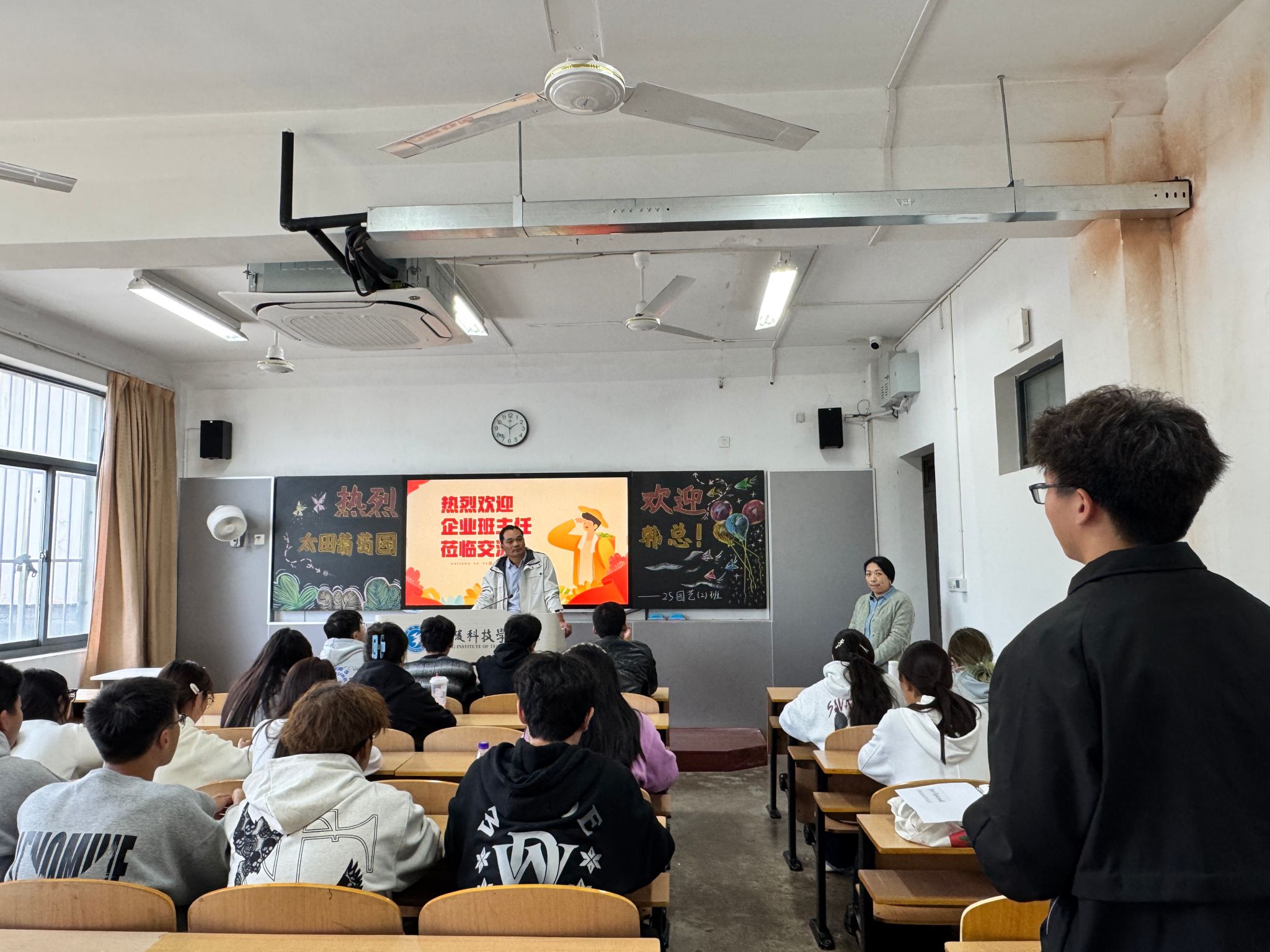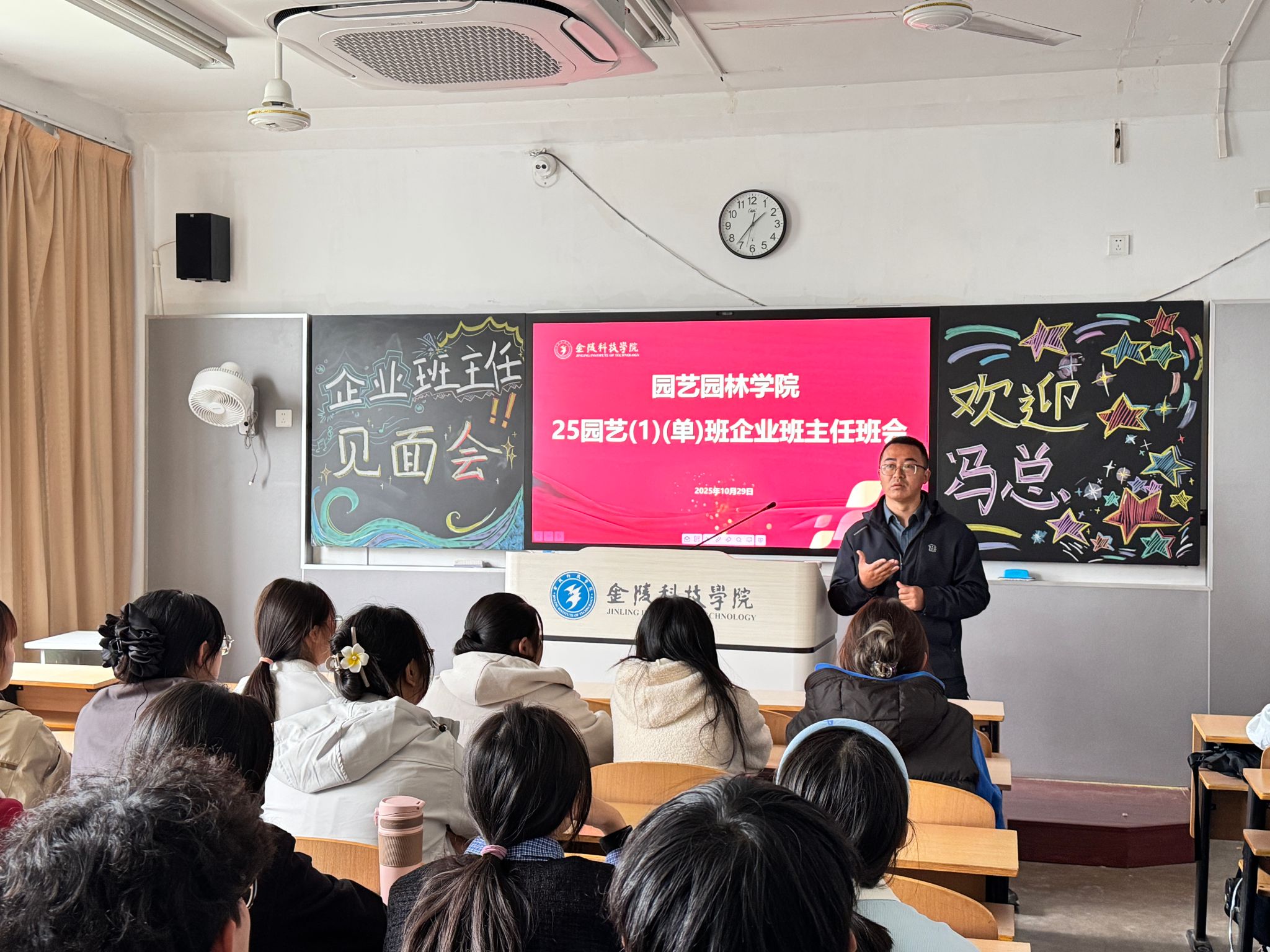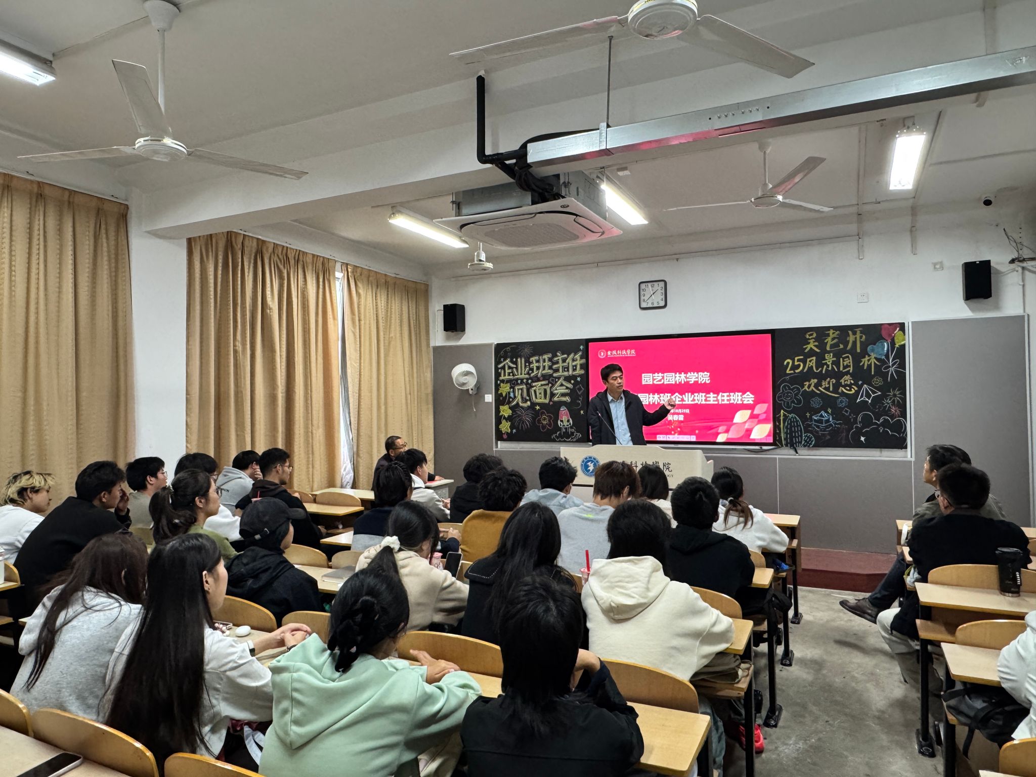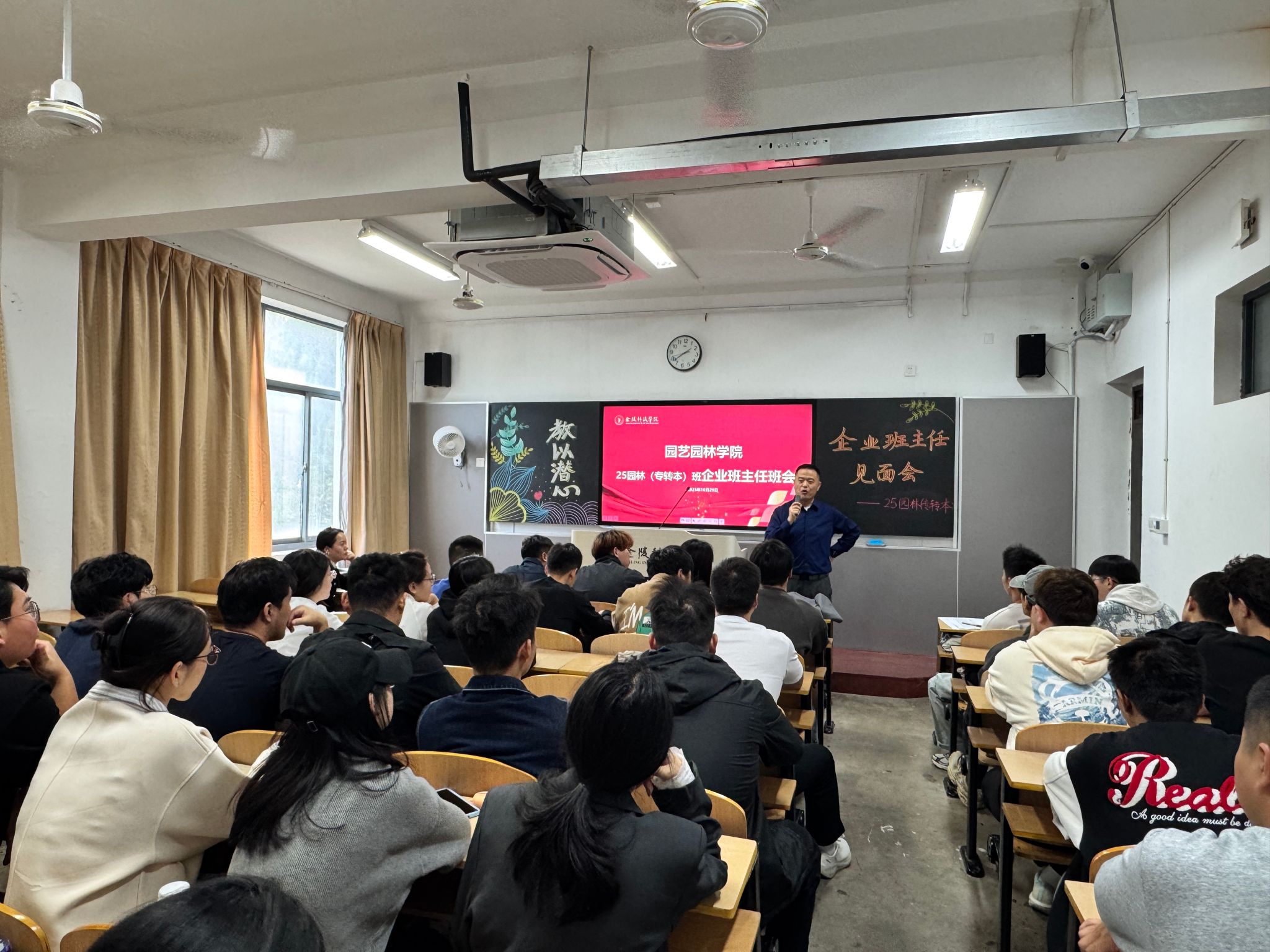 10月29日,,,,,园艺园林学院开展“2025 级企业班主任进校园”运动。。。。。南京市中山陵园治理有限责任公司、江苏大谷农业科技有限公司等9家企业认真人及校友,,,,,走进幕府校区教学楼,,,,,与2025级全体新生面扑面交流,,,,,助力学生明晰专业偏向、妄想职业路径。。。。。