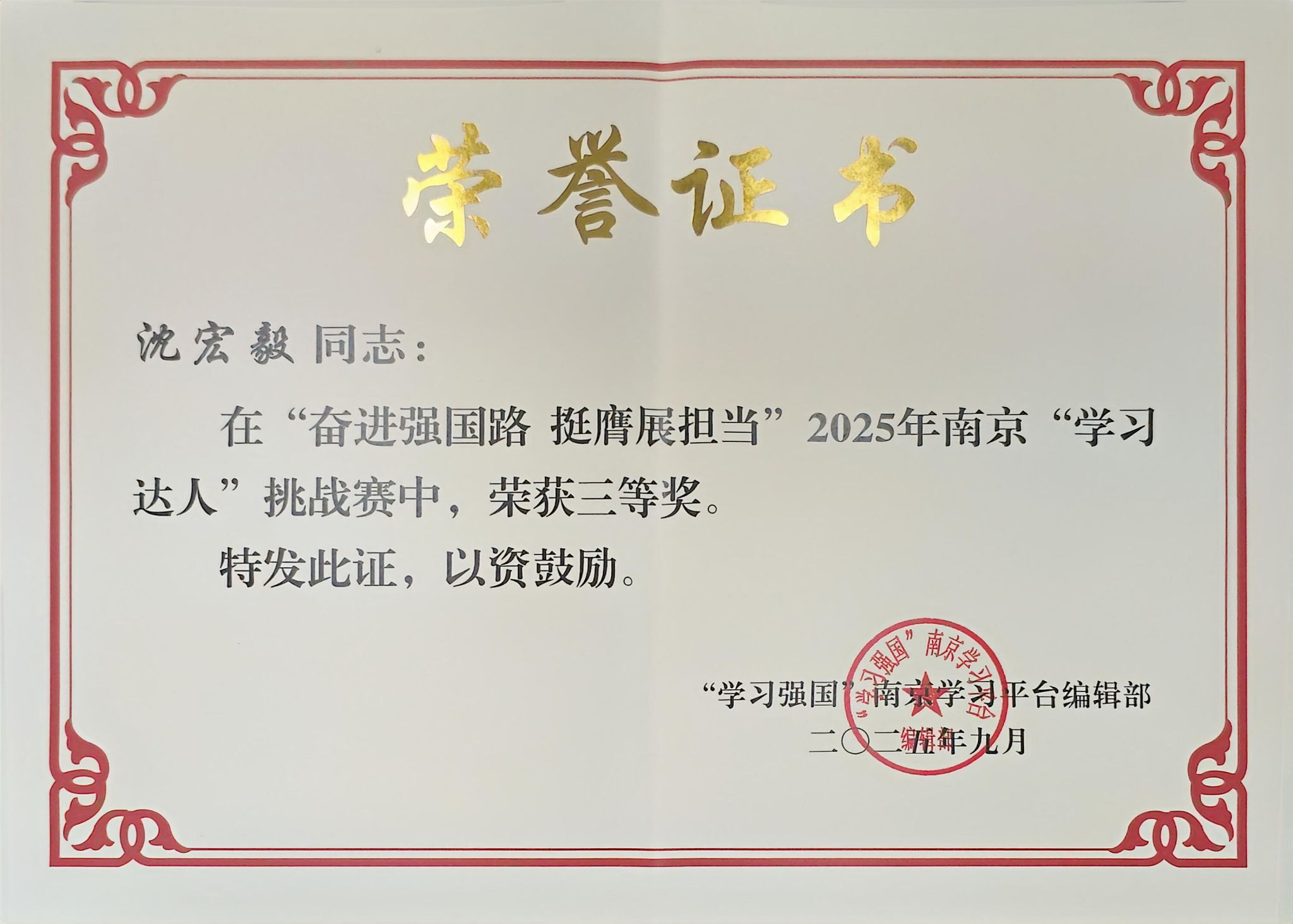 2025年9月,,,,,,,,在“学习强国”南京学习平台编辑部主理的“奋进强国路 挺膺展继续”2025年南京“学习达人”挑战赛中,,,,,,,,我院2023级盘算机科学与手艺专业学生沈宏毅依附扎实的理论素养、精彩的临场体现和起劲向上的精神风貌,,,,,,,,从众多参赛选手中脱颖而出,,,,,,,,荣获三等奖,,,,,,,,为学校赢得了声誉。。。。。。