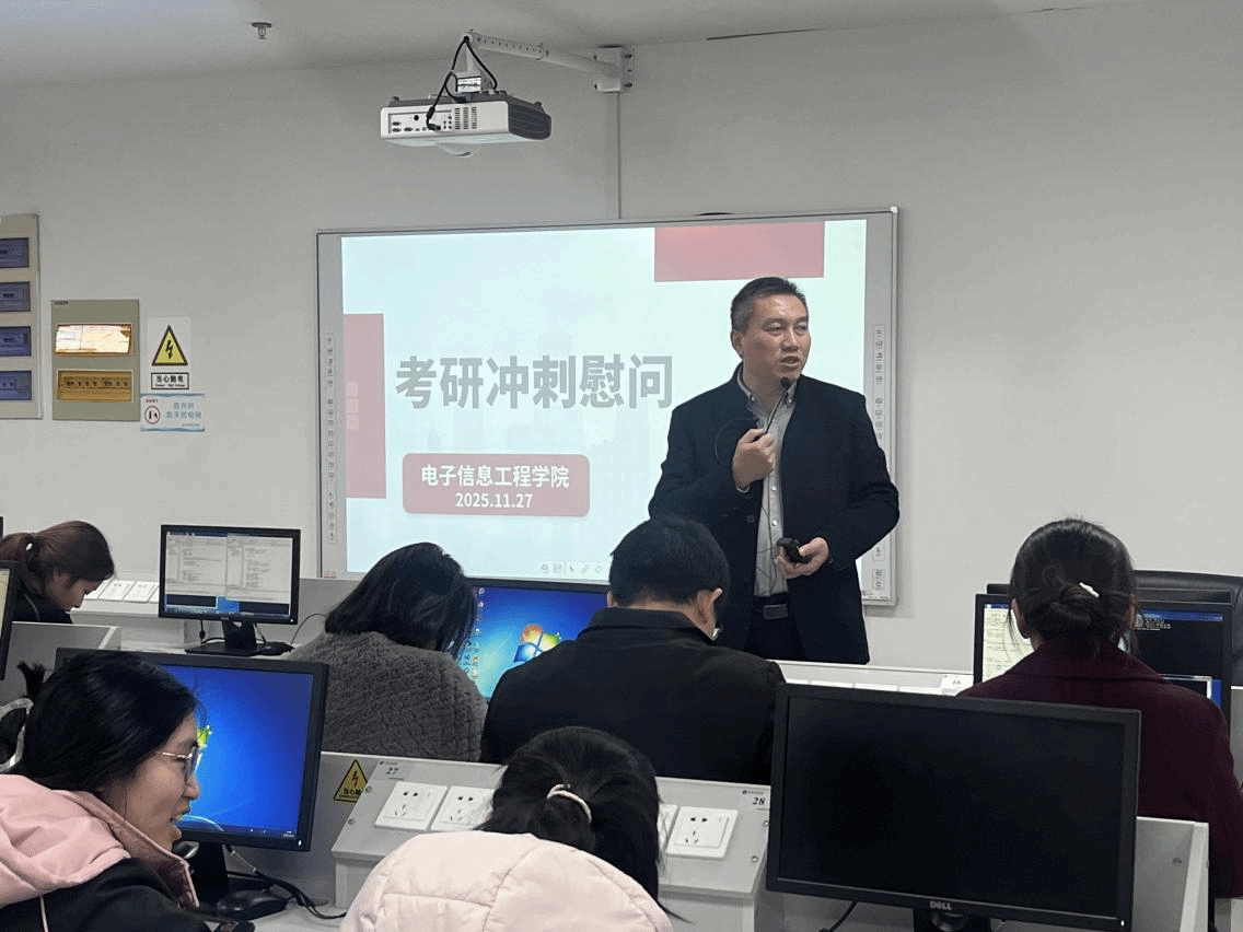 11月27日,,,,,,电子信息工程学院全心组织开展“考研冲刺慰问”运动,,,,,,为即将踏上2026年硕士研究生招生考试科场的学子们送上眷注与勉励。。。。。。。学院党委书记徐志国、院长胡国兵、党委副书记陈智慧、副院长杨娟及向导员郭晓出席了运动,,,,,,全体备战考研的26届学生加入了运动。。。。。。。
