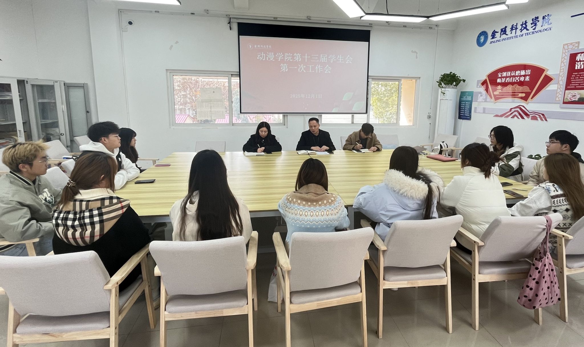 为明确新一届学生会事情偏向,,,,,,,,凝聚主干实力,,,,,,,,12月1日,,,,,,,,动漫学院第十三届学生会第一次事情聚会在南区01栋一站式学生社区召开。。。。。。学院党总支书记葛维东,,,,,,,,向导员聂钰石、殷子妍,,,,,,,,学院第十三届学生会全体主干成员加入聚会。。。。。。