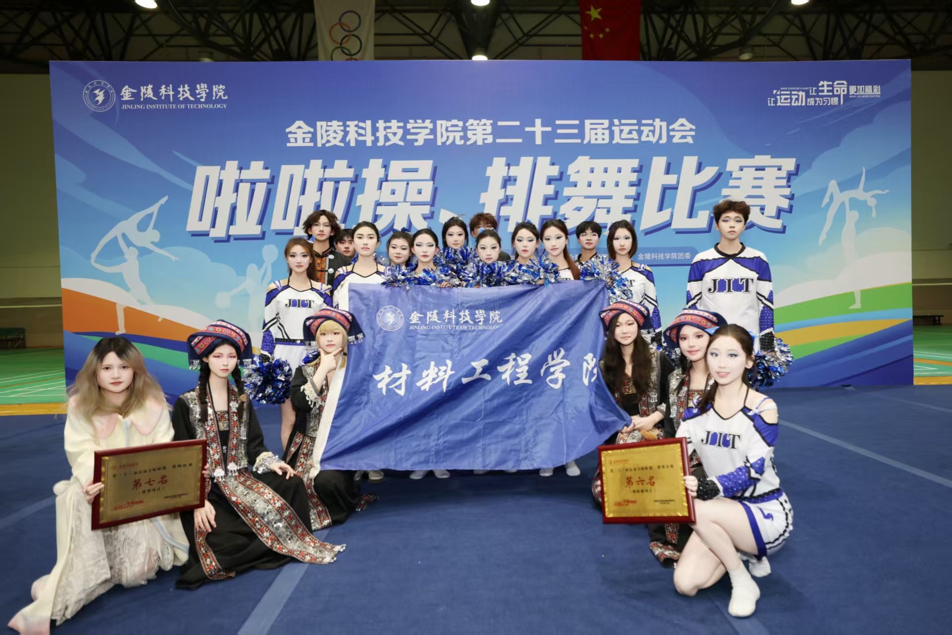 12月3日,,,,,,我校第二十三届运动会啦啦操、排舞角逐在江宁校区南区体育馆二楼盛大开幕。。。。。质料工程学院的参赛步队带着数日排演的汗水与默契登场!!!!,,,,,,最终拿下啦啦操第六名、排舞第七名、综合整体三等奖的亮眼效果。。。。。