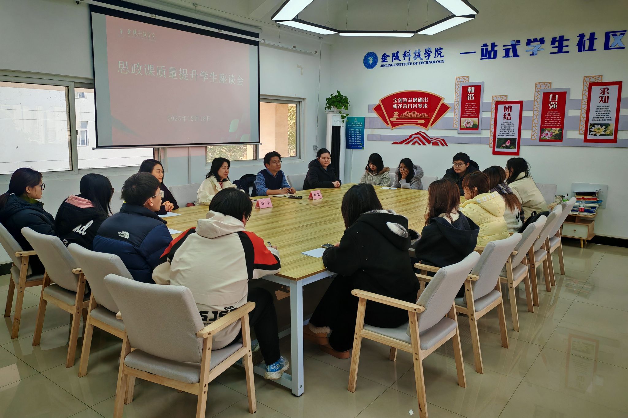 为深入贯彻落实立德树人基础使命,,,,,,,切实提升思政课教学质量,,,,,,,12月18日中午,,,,,,,马克思主义学院党总支书记部书记赵宁、副院长刘霆带队来到江宁校区南区01栋“一站式”学生社区,,,,,,,开展思政课质量提升学生座谈会。。。。。来自动漫学院大一、大二、大三各专业班级的12名学习委员代表参加了座谈会。。。。。