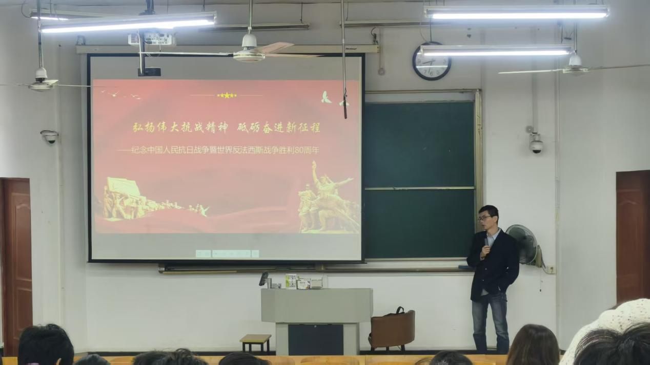 近期,,,,,,动漫学院在尚学楼7300课堂开展了本学期第一期、第二期形势与政策讲座。。。。。。。。讲座以“弘扬伟大抗战精神 砥砺奋进新征程——纪念中国人民抗日战争暨天下反法西斯战争胜利80周年”为主题,,,,,,由马克思主义学院陈昌银先生主讲。。。。。。。。学院22、23级同砚加入了讲座。。。。。。。。