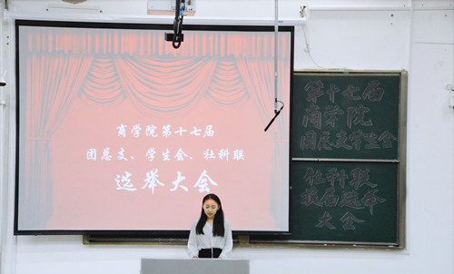 6月11日,,,,,,,,经报请校团委赞成,,,,,,,,商学院在7100课堂召开第十七届团总支、学生会、社科联换届选举大会。。。。。加入此次聚会的有商学院党总支副书记朱骅,,,,,,,,团总支副书记、学工办副主任彭小智,,,,,,,,学工办认真团学一样平常事情的向导员印鹏,,,,,,,,向导员申瑞、沈慧慧、顾磊、徐淑娟、马丽芳、沈皆希、黄丹丽、徐冰洁,,,,,,,,第十六届团总支、学生会、社科联学生主干,,,,,,,,15、16、17级各班团员和学生代表。。。。。商学院团总支副书记胡涵彧同砚主持大会。。。。。