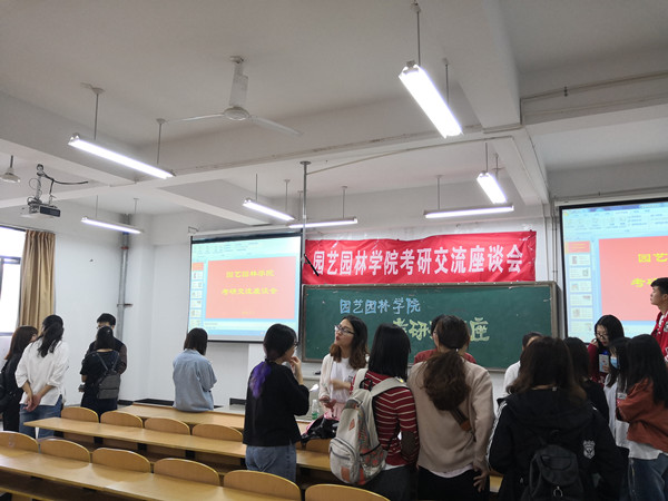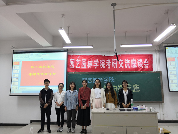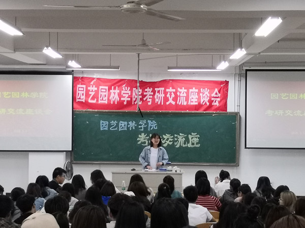 为进一步提高我院2015级学生的考研热情,,,,,,,明确考研目的,,,,,,,掌握考研技巧,,,,,,,园艺园林学院于5月5日在图教楼B205举行了考研交流座谈会,,,,,,,5名2018届、2名2017届准硕士研究生代表应邀做考研指导和履历分享,,,,,,,2015级近百名意向考研学生起劲加入本次座谈会。。。。。
