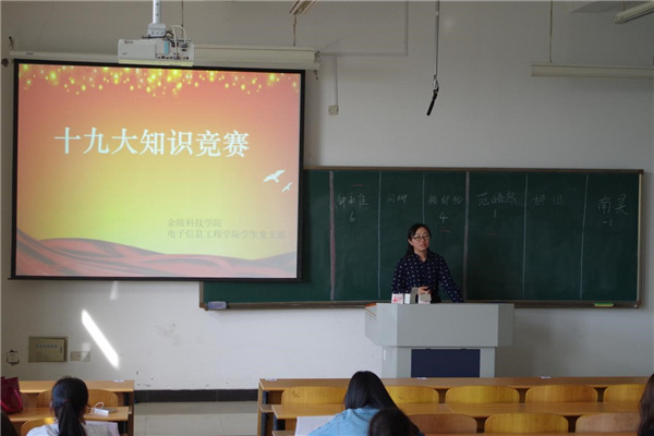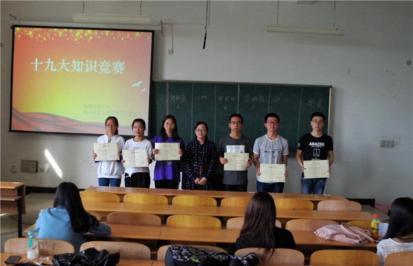 为贯彻落实党的十九大精神,,,,,电子信工程学院学生党支部于2018年5月23日15:30在3302课堂开展了党的十九大知识竞赛。。。。。。。学院学生党支部书记吴丹,,,,,全体党员、准备党员、生长工具、部分起劲分子加入了此次知识竞赛。。。。。。。