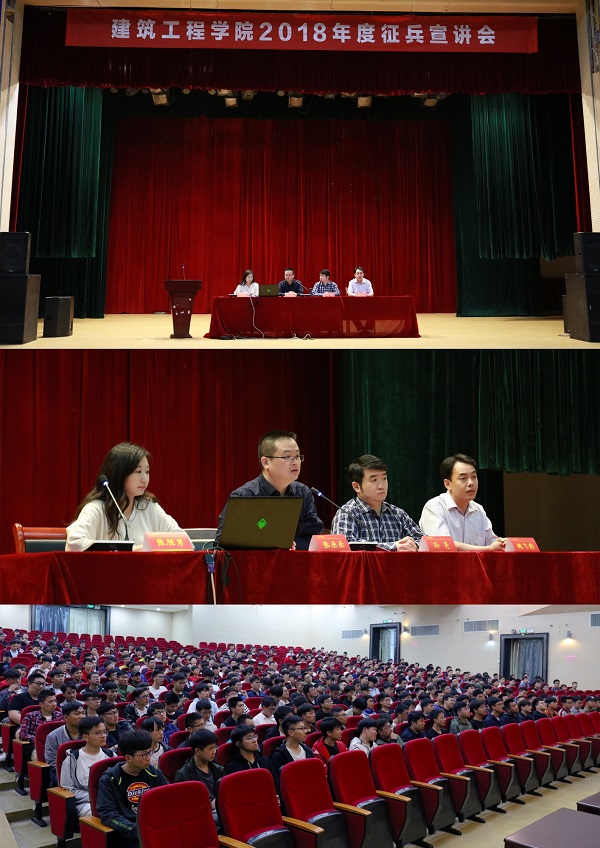 为贯彻落实国家征兵政策,,,,,,,,激励学院适龄大学生从军报国的热情,,,,,,,,4月11日下昼6:30学院在大学生运动中心剧场召开了2018年征兵宣讲会。。。。。。宣讲会由向导员张胜男主持,,,,,,,,学院党总支副书记张乐乐、向导员孙亮、鲍飞豹加入。。。。。。