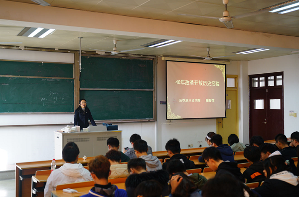 11月28日,,,,,软件工程学院、网络清静学院在1432课堂开展以“刷新开放四十年”为主题的形势与政策讲座。。。。。本次讲座由马克思学院陶爱萍先生担当主讲人,,,,,软件工程学院、网络清静学院部分学生加入讲座。。。。。