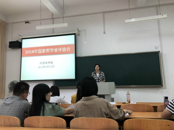 9月25日下昼,,,,,,外国语学院在4105课堂召开了2018年国家奖学金评选会。。。。。聚会由外国语学院团总支书记王奕先生主持,,,,,,学院全体班主任、向导员及部分学生代表加入了此次聚会。。。。。