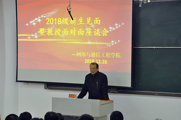 2018年12月26日下昼,,,,,网络与通讯工程学院在8300课堂召开了2018级新生晤面会暨教授面扑面座谈会。。。。。贲德院士,,,,,院党委书记陈健,,,,,院党委副书记、院长田锦,,,,,副院长王池社,,,,,网络工程系主任翟洪军,,,,,通讯工程系主任孟超,,,,,光电工程系副主任陈鹏及向导员孙成先生出席了本次座谈会,,,,,聚会由院党委副书记涂远主持。。。。。